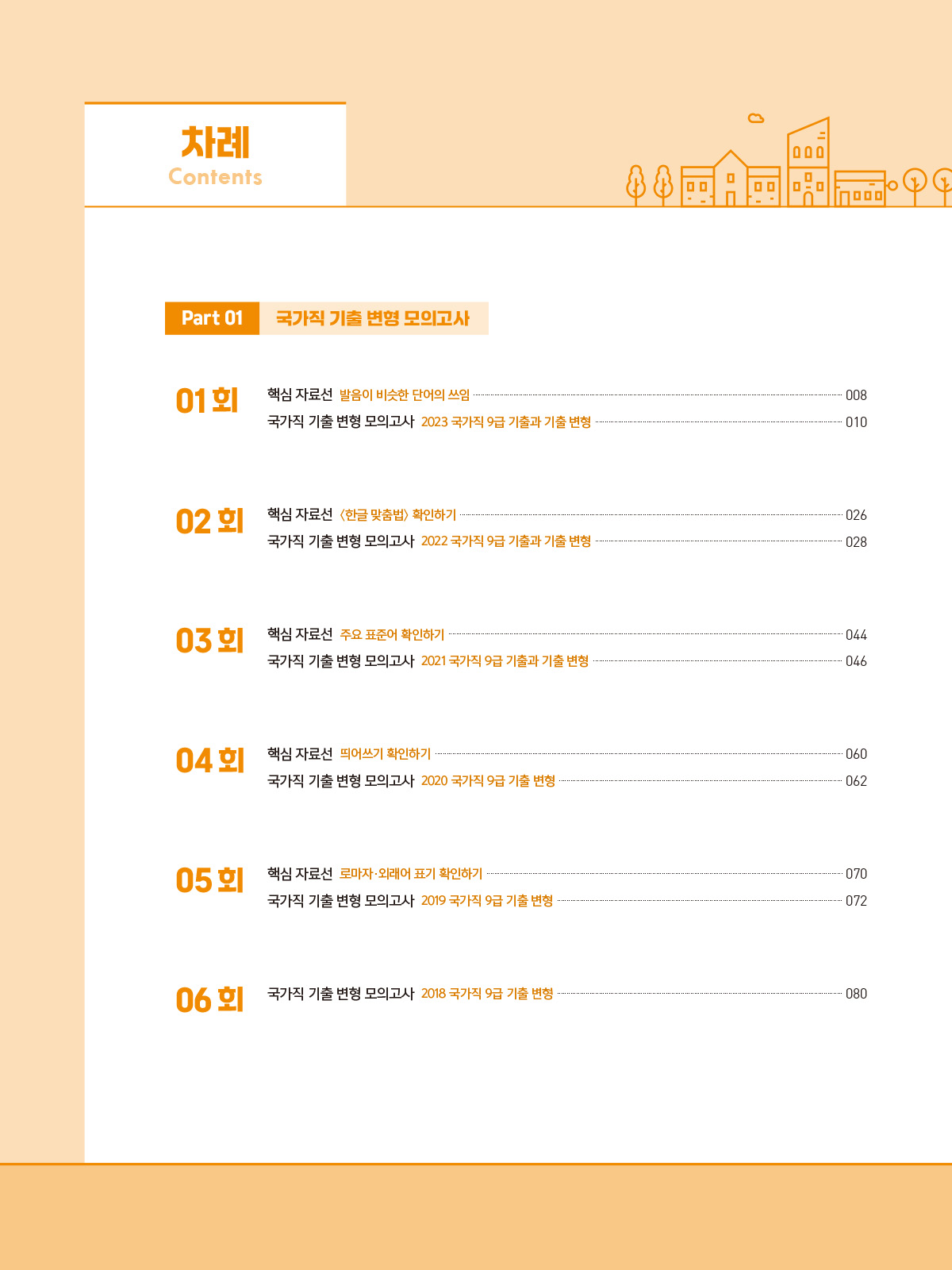 - 핵심 자료선: 발음이 비슷한 단어, 〈한글 맞춤법〉, 주요 표준어, 띄어쓰기, 로마자 · 외래어 표기, 올바른 문장 쓰기, 주요 기출 어휘, 주요 기출 관용 표현과 속담, 주요 기출 한자어, 주요 기출 한자 성어 등 풍부한 암기 자료 수록