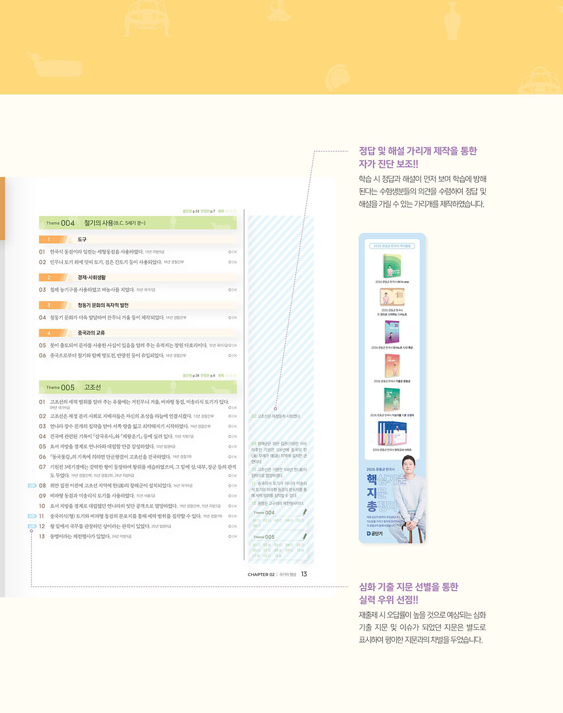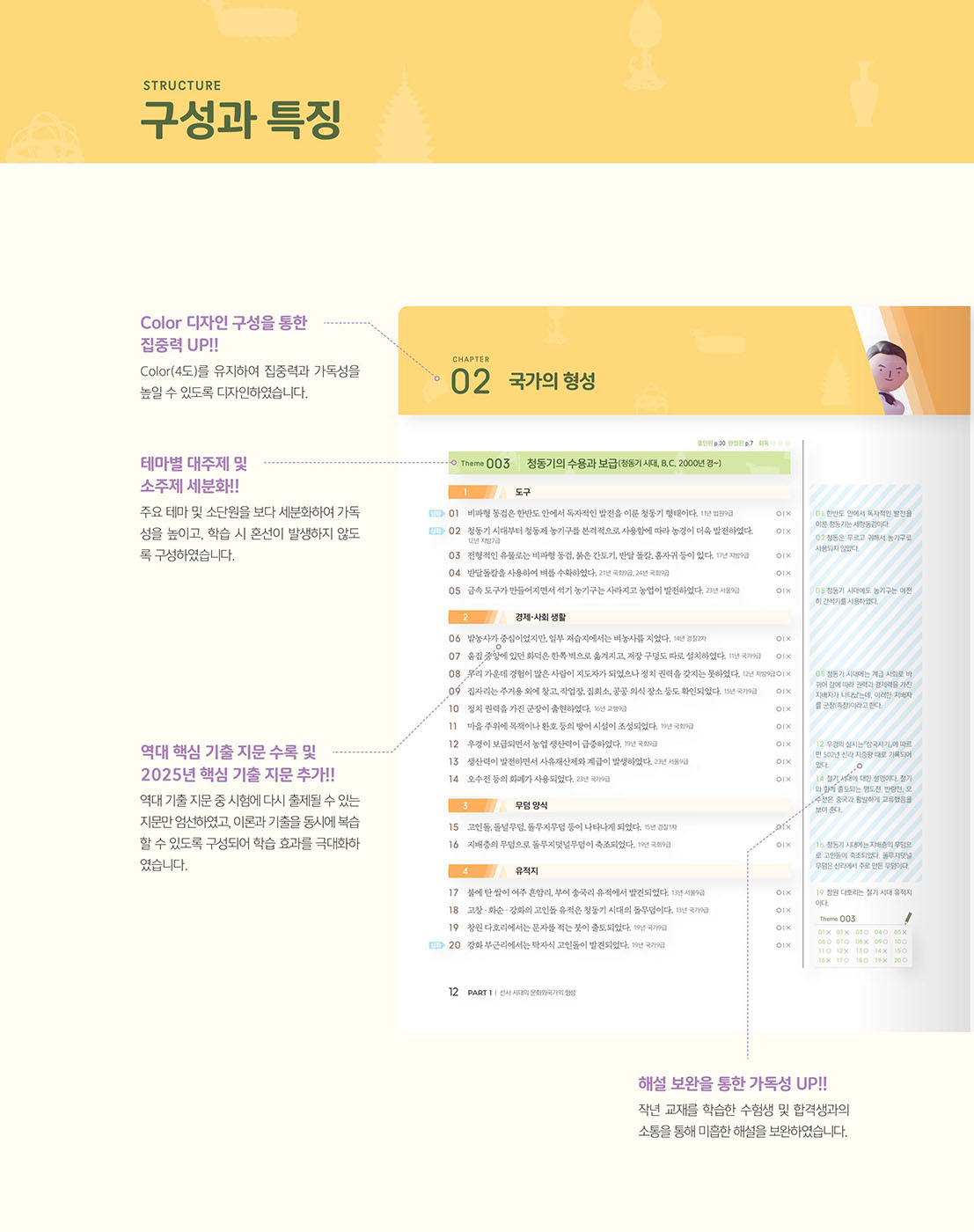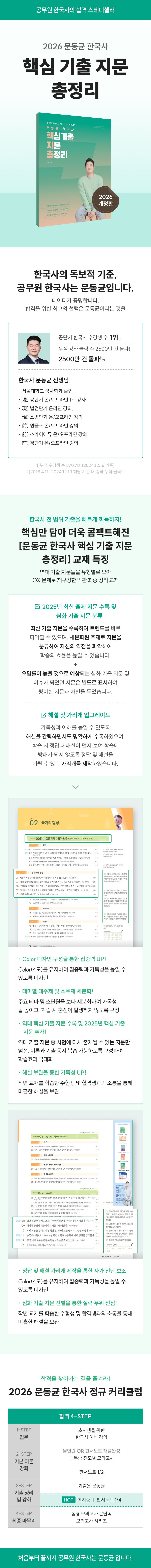 2025년에 출제된 한국사 시험의 기출 지문을 수록하여 최신 기출 트렌드를 바로 파악할 수 있습니다. 또한 세분화된 주제로 지문을 분류하였기 때문에 자신의 약점을 파악하여 학습의 효율을 높일 수 있습니다. 재출제 시 오답률이 높을 것으로 예상되는 심화 기출 지문 및 이슈가 되었던 지문은 별도로 표시하여 평이한 지문과의 차별을 두었습니다.