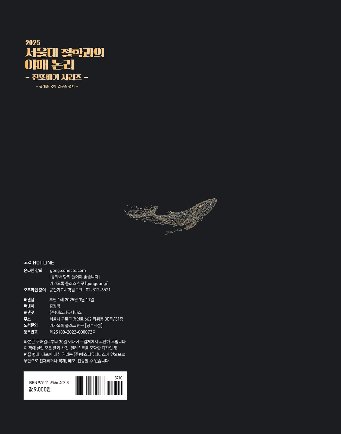 《2025 서울대 철학과의 야매 논리》는 유대종 선생님의 진또배기 문제 풀이 시리즈 중 하나로, 변화하는 공무원 국어 시험에 꼭 나올 만한 논리 개념을 압축하여 담아낸 교재입니다. 이를 통해 논리 영역의 출제 유형과 개념을 빠르게 익히고 문제 풀이를 연습할 수 있습니다.