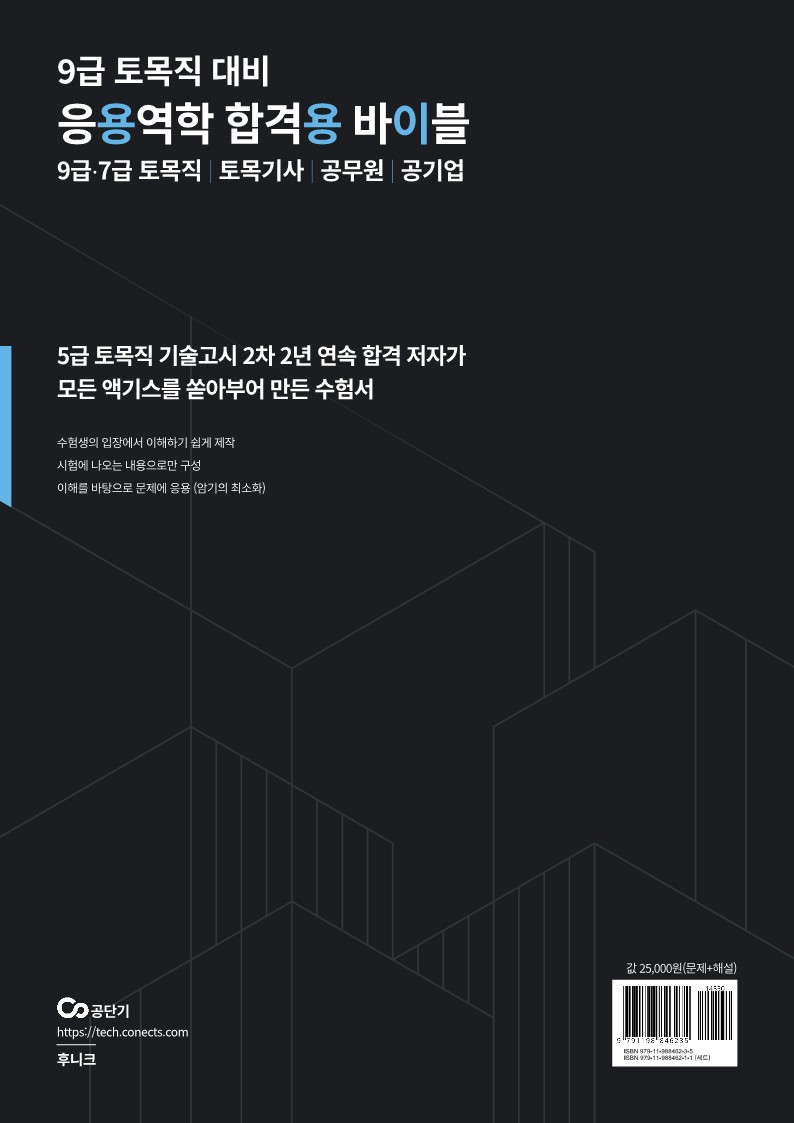 응용역학 이론과 실전 문제를 집약한 토목직 기본 수험서. 토목에 대해 1도 몰랐던 노베이스 학생들도 쉽게 이해할 수 있도록 그림과 도표 위주로 쉽게 구성하였다. 시험에 나오는 내용 위주로 구성하였고, 단기간에 고득점을 목표로 하는 수험생들에게 적합한 수험서이다. 기존의 암기위주 공부방식에서 탈피하고 이해를 바탕으로 문제에 응용시켜 나가는 트레이닝을 통해 빠르고 안정적인 고득점 취득을 가능하게 해주는 최적의 수험서이다.