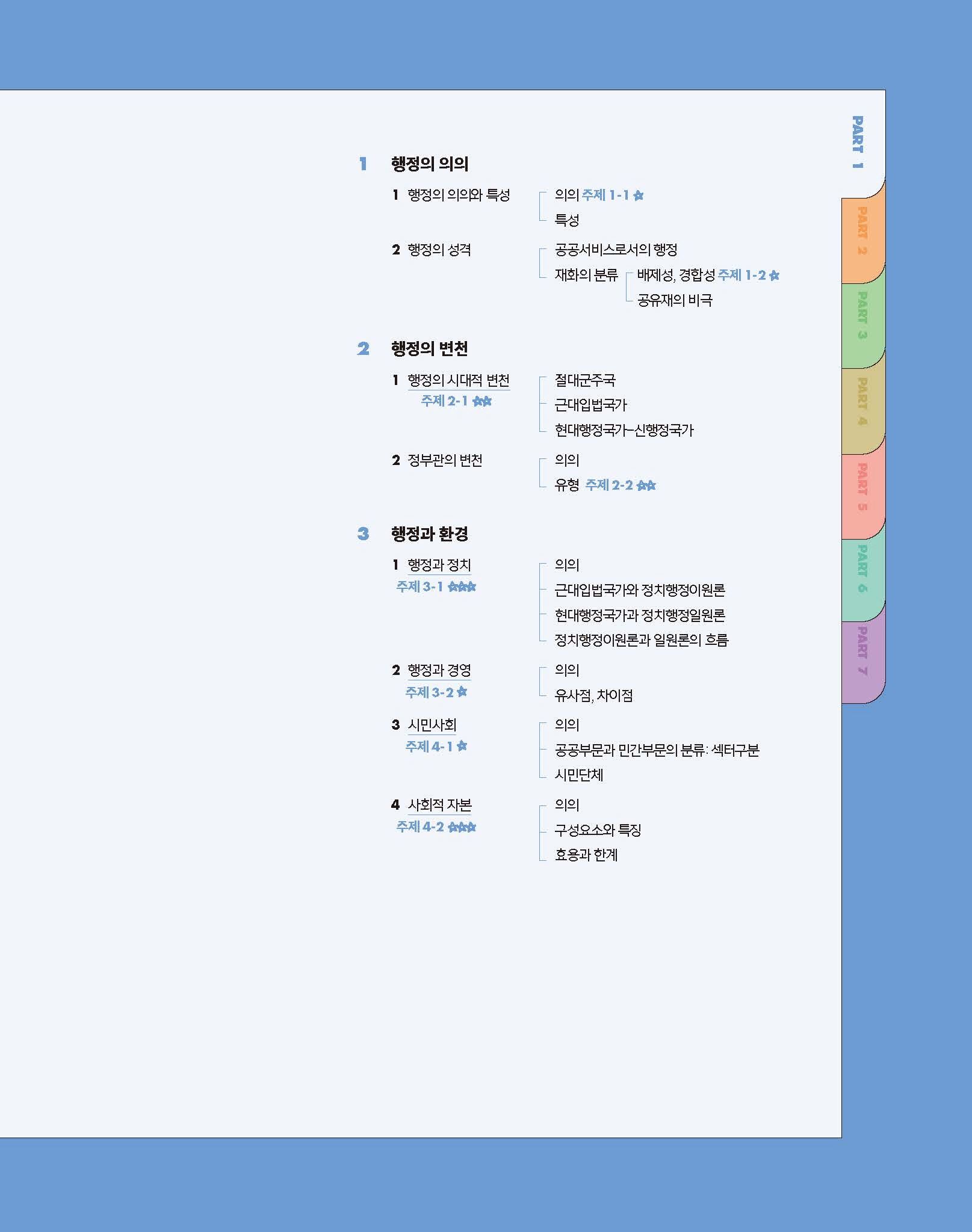 문제를 주제별로 배치했습니다. 각 주제는 출제 문항 단위로 구성했으며, 같은 주제 내 문제들은 선지의 연계성이 드러나도록 배열했습니다. 또한 난이도가 점점 높아지도록 순서를 두어, 최근 문항들의 난이도가 어떤 방식으로 높아지는지 파악하고 나아가 실력 향상을 도모할 수 있도록 했습니다. 학습 시간이 부족한 분들을 위해 별표 개수로 풀어보아야 할 우선 순위를 표시해두었습니다. 향후 별표 3개짜리 필수 문항은 ‘2026 최영희행정학 빠른기출 400제’로 모아 출간할 예정입니다.
