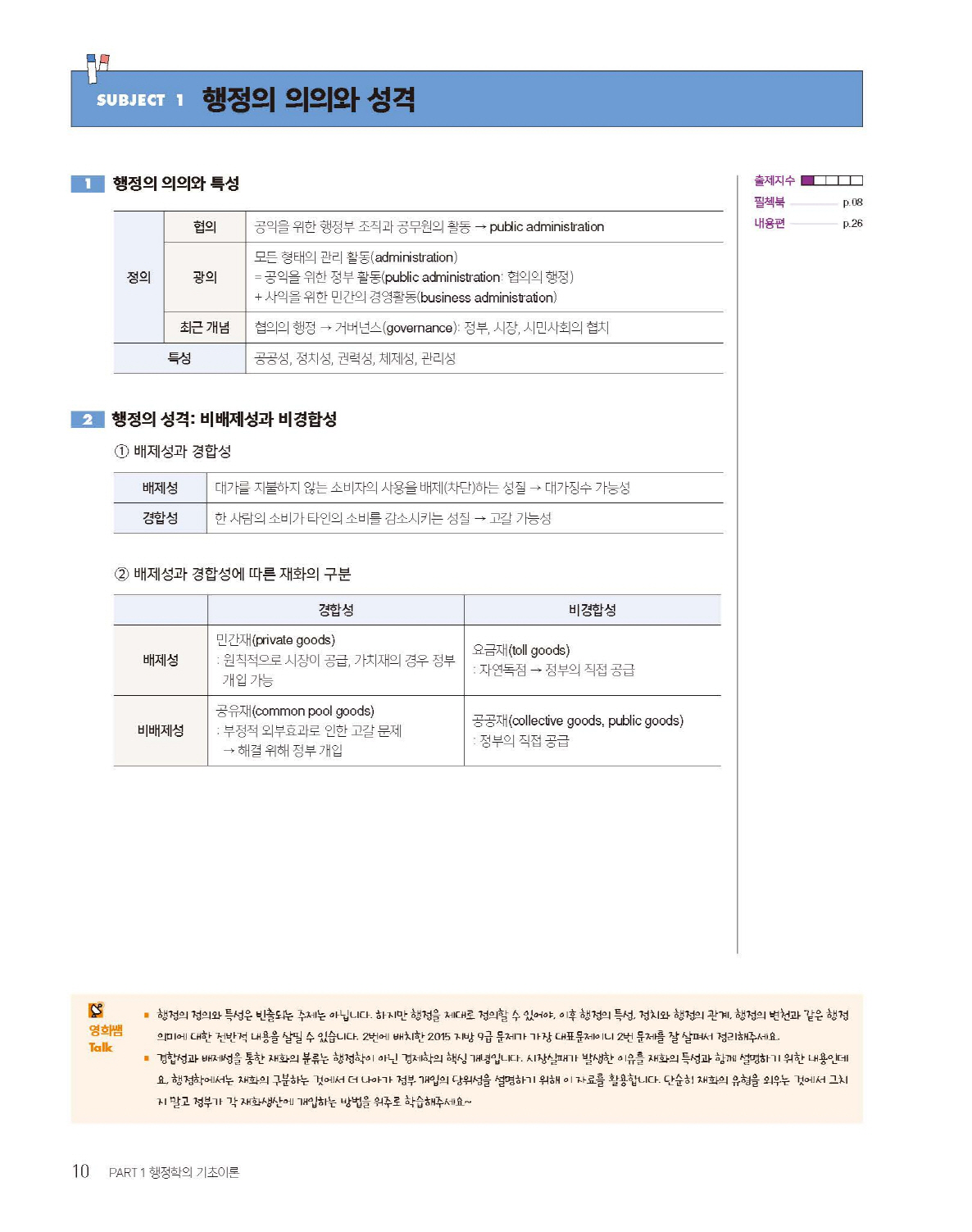 그 외에도 수험생들의 학습에 편리하고 유용하도록 배려한 부분들이 있습니다. 주제별로 일목요연하게 내용정리를 해 두어 문제 풀기 전과 후에 확인할 수 있게 했고, 주요 문항에도 내용정리를 추가해 문제를 풀면서 빠르게 학습할 수 있게 했습니다. ‘2026 최영희행정학 내용편’ 및 ‘2026 최영희행정학 필기체크북’ 페이지를 적어 두었으므로 좀 더 자세하고 포괄적인 복습이 필요한 경우 편리하게 책을 연계시켜 볼 수 있습니다. 또한 전체 문항 연번을 별도로 달아 진도를 파악할 수 있게 했습니다.