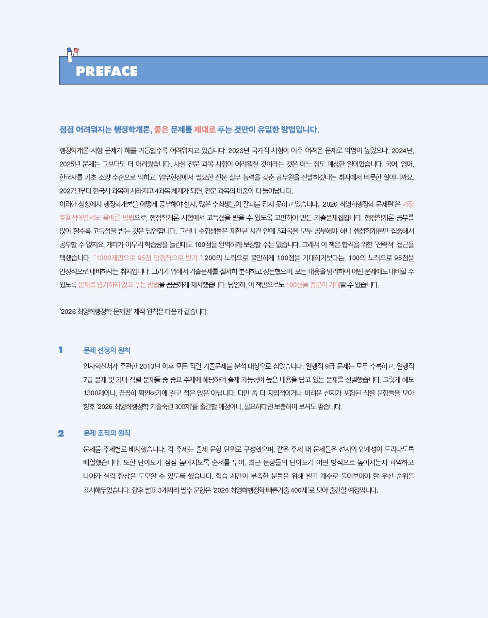 인사혁신처가 주관한 2013년 이후 모든 직렬 기출문제를 분석 대상으로 삼았습니다. 일행직 9급 문제는 모두 수록하고, 일행직 7급 문제 및 기타 직렬 문제들 중 중요 주제에 해당하며 출제 가능성이 높은 내용을 담고 있는 문제를 선별했습니다. 그렇게 해도 1300제이니, 꼼꼼히 확인하기에 결코 적은 양은 아닙니다. 다만 좀 더 지엽적이거나 어려운 선지가 포함된 직렬 문항들을 모아 향후 ‘2026 최영희행정학 기출숙련 300제’를 출간할 예정이니, 필요하다면 보충하여 보셔도 좋습니다.