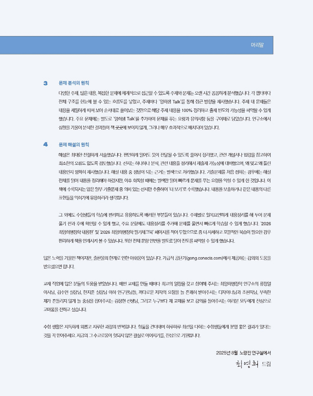 교재 작업에 많은 분들의 도움을 받았습니다. 매번 교재를 만들 때마다 최고의 열정을 갖고 참여해 주시는 최영희행정학 연구소의 류정열 이사님, 김수연 실장님, 한지훈 실장님 이하 연구원님들, 까다로운 저자의 요청을 늘 흔쾌히 받아주시는 디자이너님과 조판자님, 부족한 제가 흔들리지 않게 늘 중심을 잡아주시는 김정현 선생님, 그리고 누구보다 제 교재를 보고 강의를 들어주시는 여러분 모두에게 진심으로 고마움을 전하고 싶습니다.