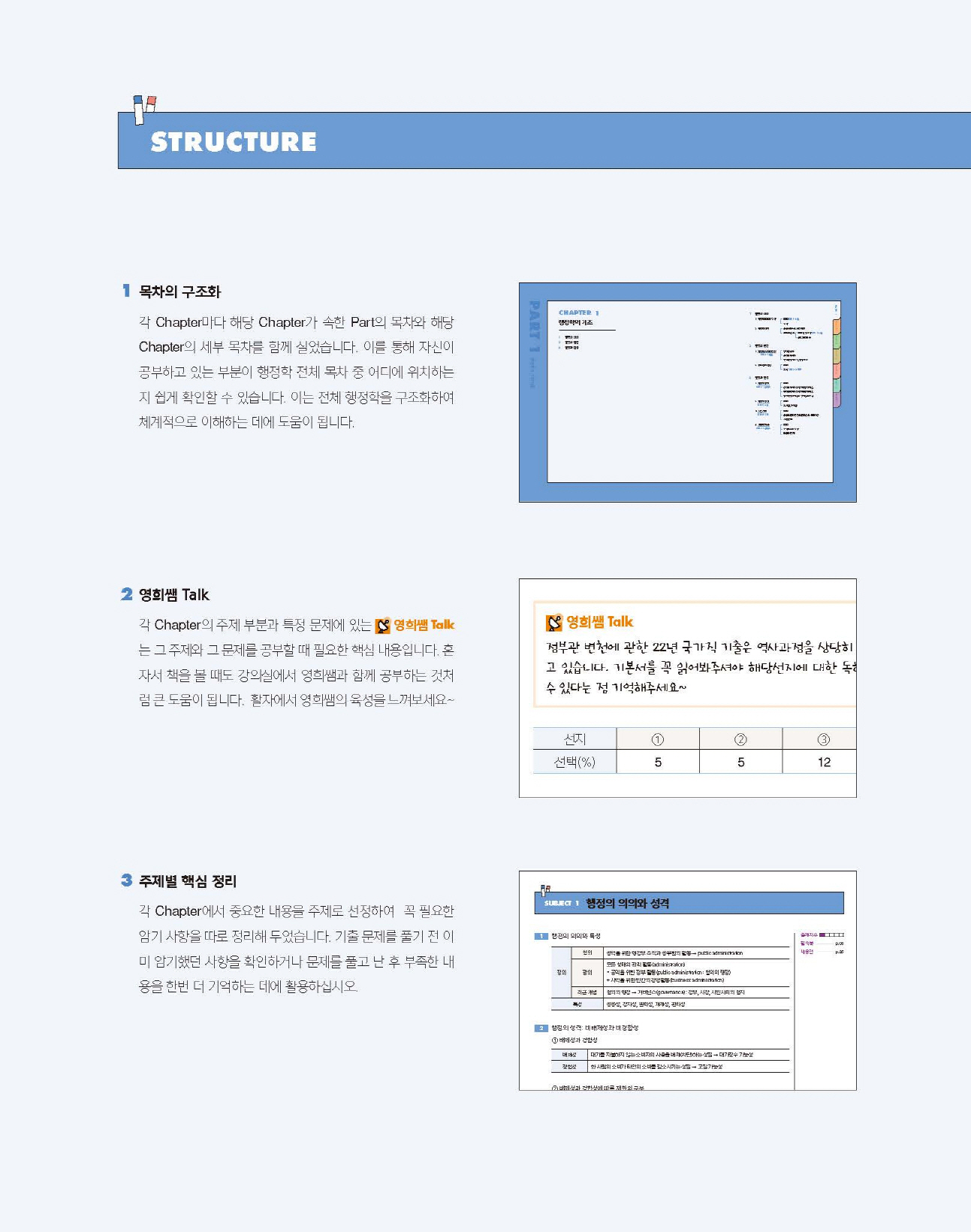 다양한 주제, 많은 내용, 복잡한 문제에 체계적으로 접근할 수 있도록 주제와 문제는 오랜 시간 꼼꼼하게 분석했습니다. 각 챕터마다 전체 구조를 한눈에 볼 수 있는 흐름도를 넣었고, 주제마다 ‘영희샘 Talk’를 통해 접근 방향을 제시했습니다. 주제 내 문제들은 내용을 세밀하게 따져 보아 순서대로 풀어보는 것만으로 해당 주제 내용을 100% 정리하고 출제 빈도와 가능성을 파악할 수 있게 했습니다. 주요 문제에는 별도로 ‘영희샘 Talk’를 추가하여 문제를 푸는 요령과 유의사항 등을 구어체로 담았습니다. 연구소에서 심혈을 기울여 분석한 결과들이 책 곳곳에 보이지 않게, 그러나 매우 효과적으로 배치되어 있습니다.