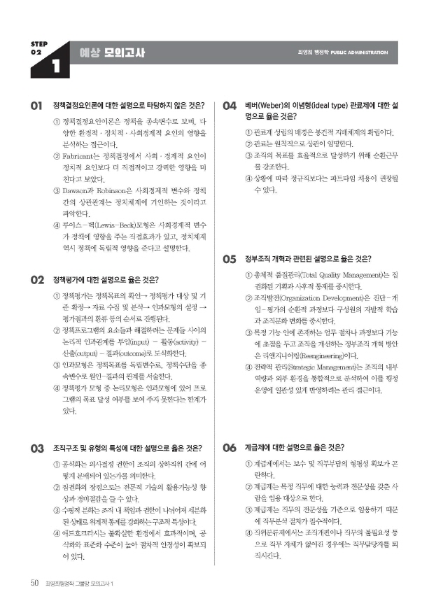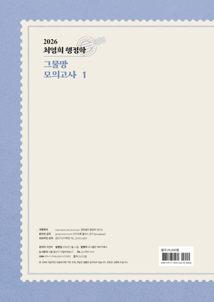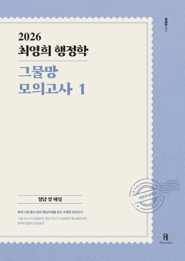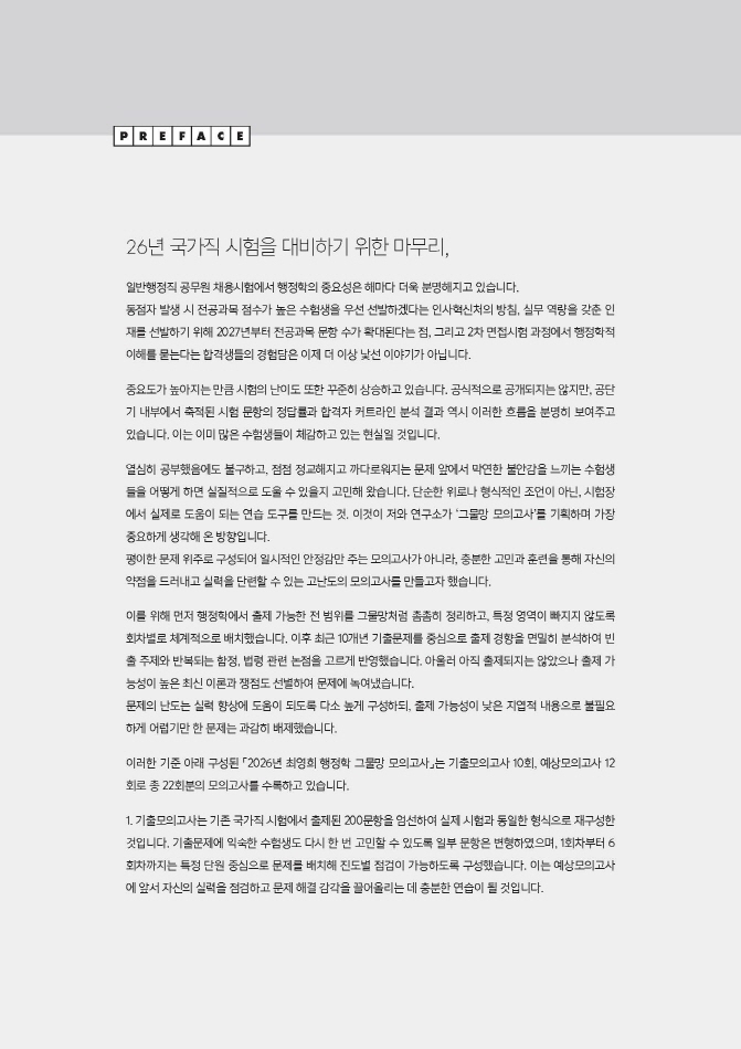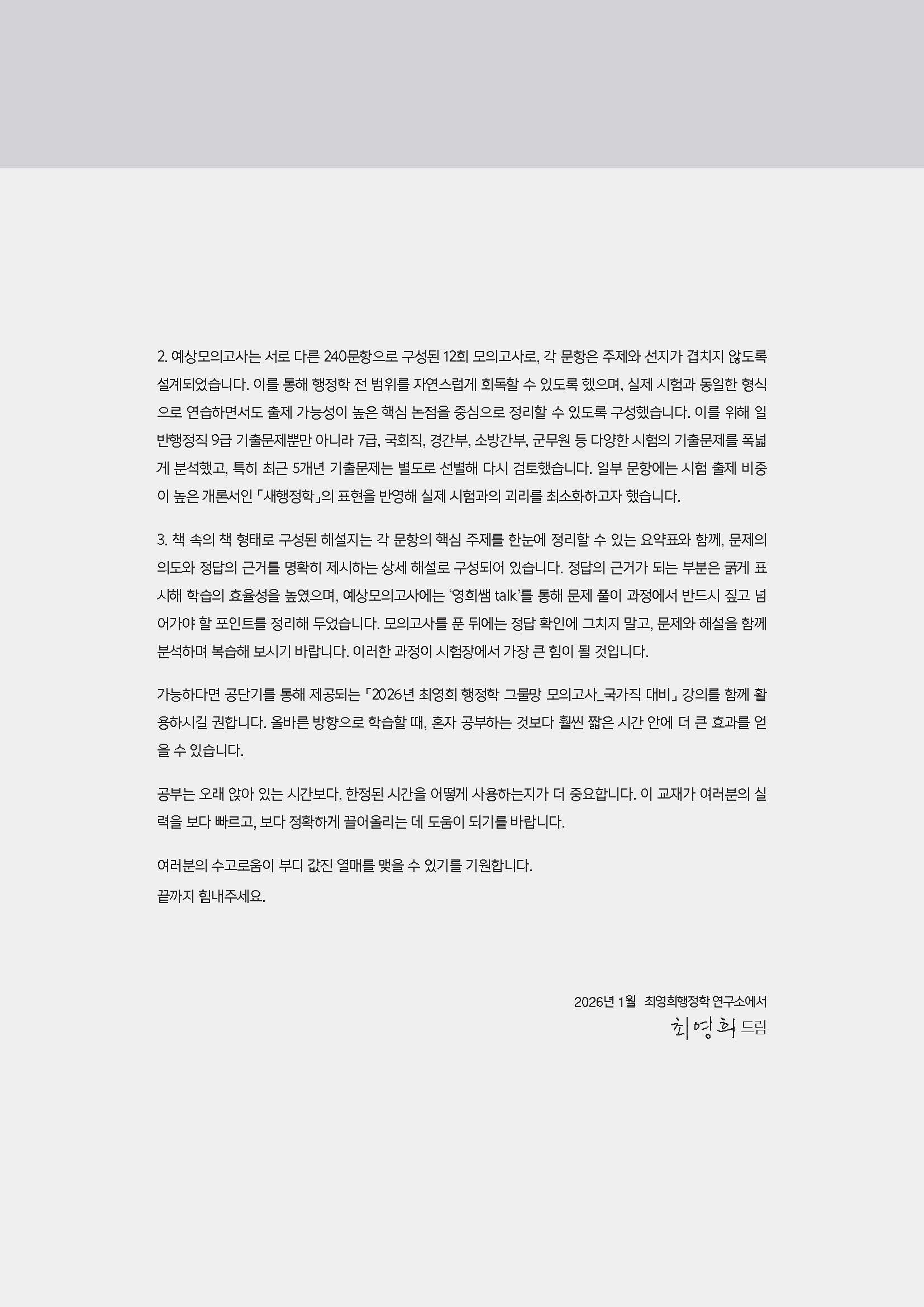 이러한 기준 아래 구성된 「2026년 최영희 행정학 그물망 모의고사」는 기출모의고사 10회, 예상모의고사 12회로 총 22회분의 모의고사를 수록하고 있습니다.