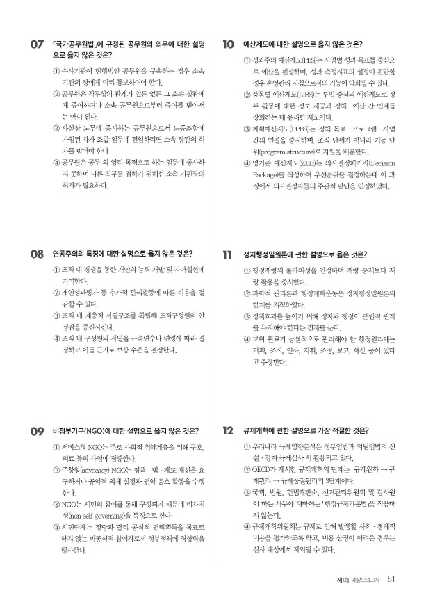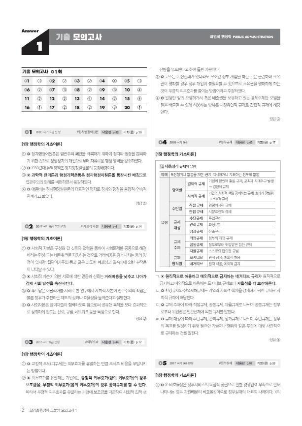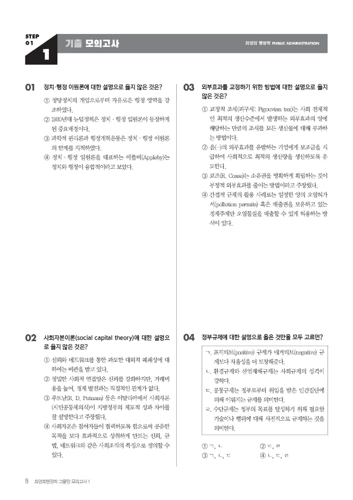 2. 예상모의고사는 서로 다른 240문항으로 구성된 12회 모의고사로, 각 문항은 주제와 선지가 겹치지 않도록 설계되었습니다. 이를 통해 행정학 전 범위를 자연스럽게 회독할 수 있도록 했으며, 실제 시험과 동일한 형식으로 연습하면서도 출제 가능성이 높은 핵심 논점을 중심으로 정리할 수 있도록 구성했습니다. 이를 위해 일반행정직 9급 기출문제뿐만 아니라 7급, 국회직, 경간부, 소방간부, 군무원 등 다양한 시험의 기출문제를 폭넓게 분석했고, 특히 최근 5개년 기출문제는 별도로 선별해 다시 검토했습니다. 일부 문항에는 시험 출제 비중이 높은 개론서인 「새행정학」의 표현을 반영해 실제 시험과의 괴리를 최소화하고자 했습니다.