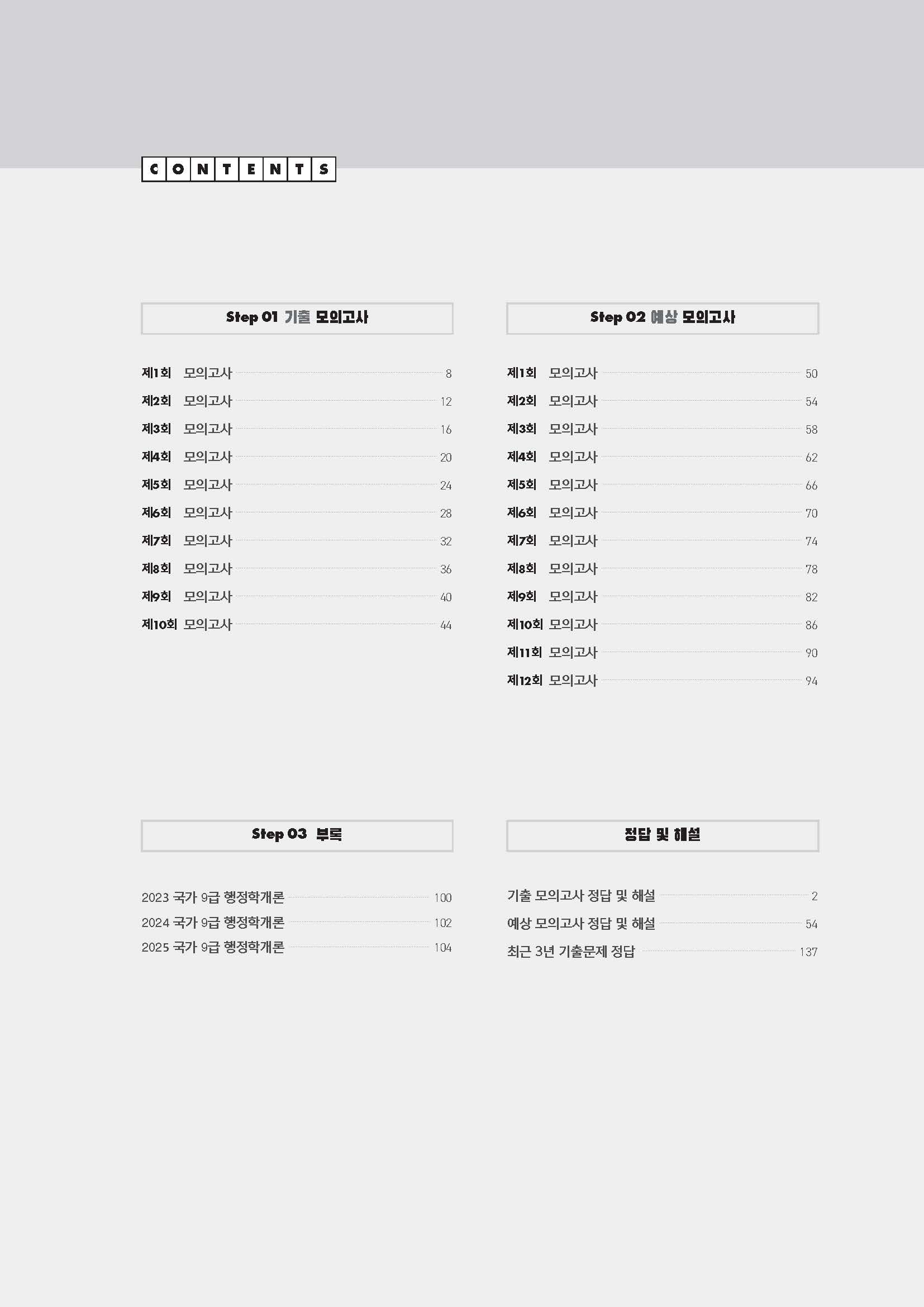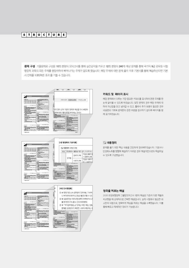 이를 위해 먼저 행정학에서 출제 가능한 전 범위를 그물망처럼 촘촘히 정리하고, 특정 영역이 빠지지 않도록 회차별로 체계적으로 배치했습니다. 이후 최근 10개년 기출문제를 중심으로 출제 경향을 면밀히 분석하여 빈출 주제와 반복되는 함정, 법령 관련 논점을 고르게 반영했습니다. 아울러 아직 출제되지는 않았으나 출제 가능성이 높은 최신 이론과 쟁점도 선별하여 문제에 녹여냈습니다.