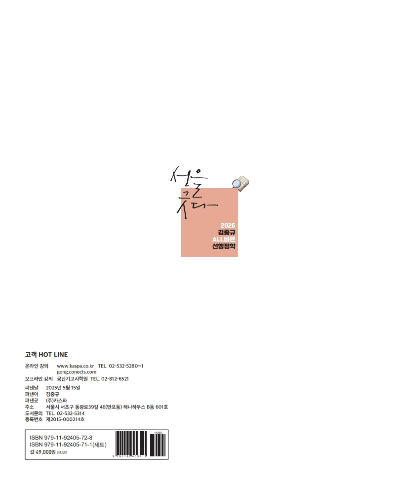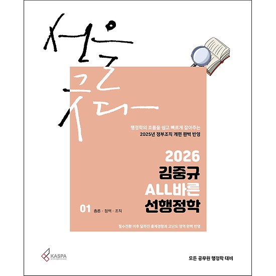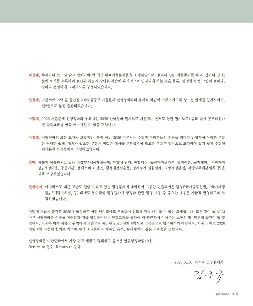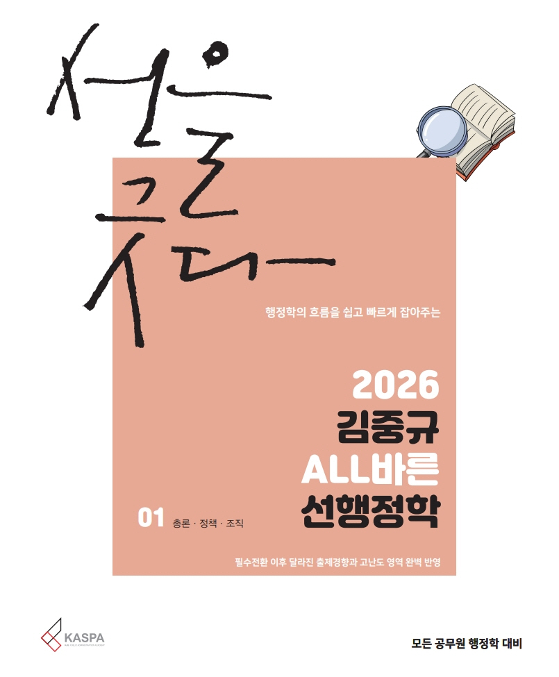이번에 새롭게 출간된 2026 선행정학은 어떤 난이도에도 부족함이 없도록 완벽 대비할 수 있는 교재입니다. 모든 것이 올(ALL)바른 선행정학은 수험생 여러분과 저를 행정학이라는 연결고리를 통하여 더 끈끈하게 이어주는 소통의 장, 담론의 공간이 될 것입니다. 모쪼록 더욱 새롭고 완벽해진 모습으로 출간된 2026 선행정학으로 고득점으로 합격하시기 바랍니다. 아울러 이번 2026 선행정학 교정에 힘써준 카스파 수석 조교들이자 제자인 은선, 유리에게도 깊은 고마움을 전합니다.