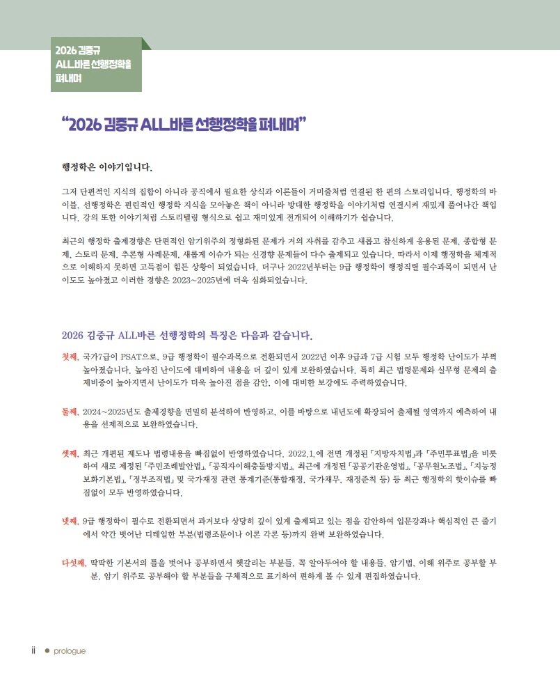 일곱째, 기본서에 이어 곧 출간될 2026 김중규 기출문제 선행정학과의 유기적 학습이 이루어지도록 장·절 편제를 일치시키고, 전2권으로 분권 출간되었습니다.