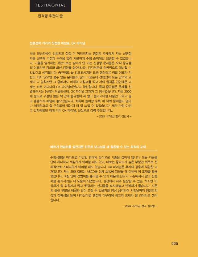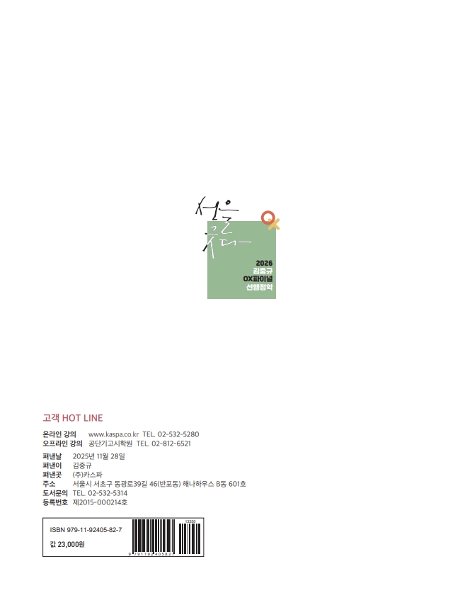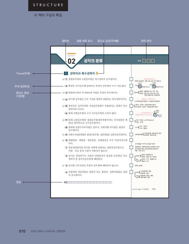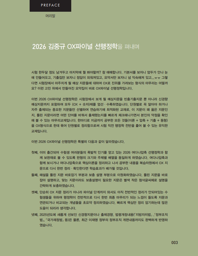 이번 2026 OX파이널 선행정학은 시험장에서 보게 될 예상지문을 빈출기출지문 뿐 아니라 신경향 예상지문까지 포함하여 모두 (OX + 숫자)제를 엄선·수록하였습니다. 단원별로 꼭 알아야 하거나 자주 출제되는 중요한 지문들만 선별하여 연습하기에 최적화된 교재로. 이 지문이 왜 옳은 지문인지, 틀린 지문이라면 어떤 단어를 바꿔서 출제했는지를 빠르게 체크해나가면서 본인의 약점을 확인해 볼 수 있는 마무리교재입니다. 한마디로 지금까지 공부한 모든 것들(이론 + 압축 + 기출 + 동형)을 OX형식으로 한데 묶어 단원별로 정리함으로써 시험 직전 행정학 전반을 훑어 볼 수 있는 유익한 교재입니다.