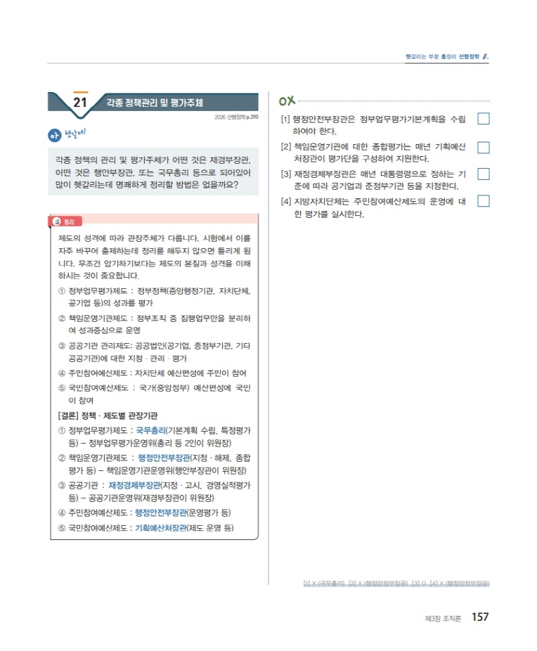 예를 들어 [자치단체를 대표하는 기관은 단체장인가, 지방의회인가?]에서 결론은 자치단체를 대외적으로 대표하는 기관은 단체장이지만 주민을 대표하는 기관은 지방의회입니다. 즉 [외부대표 : 단체장, 주민대표 : 지방의회] 이런 식으로 깔끔한 정리가 필요한 것이지요. 또 [자본예산은 안정화를 저해하는가, 안정화에 기여하는가?]에서 결론은 경제안정화에는 기여하지만 재정안정화는 저해할 수 있습니다. 즉 [경제 : 안정화, 재정 : 불안정]입니다. 이런게 정리가 되어있지 않은 상태에서 “대표”또는 “안정”이란 단어에만 매달려 있으면 틀리는 문제는 반복해서 계속 틀리게 되어 있습니다. 60∼70점대에 머무는 대부분의 수험생들이 바로 이런 부분들이 부족한 것입니다. 이런 부분들만 정리를 해준다면 바로 점수가 30점은 오를 수 있습니다.
