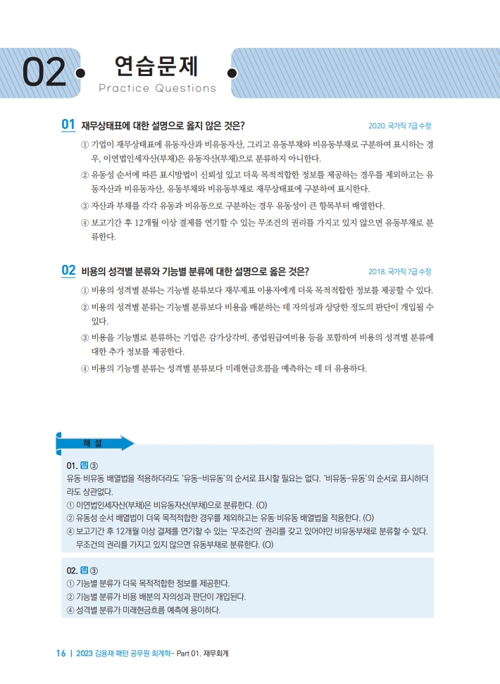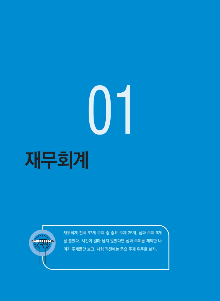 실전에서는 20문제를 20분 안에 풀어야 하기 때문에, 200문제면 200분 안에 풀 수 있는 분량입니다. 시험 직전에 오전에 200문제를 전부 풀고, 오후에 오답 풀이를 하면 하루 안에 회계학 전 범위를 볼 수 있습니다. 두 번째 푸는 것이기 때문에 답이 표시되어 있어도 상관없습니다. 답이 몇 번인지는 전혀 중요하지 않습니다. 중요한 것은 답에 도달하는 과정입니다. 다시 풀었을 때도 똑같은 과정을 거쳐 정답을 골라낼 수 있다면 공부를 잘 해오신 것입니다. 답이 표시되어 있는 것이 정 불편하신 분들은 책을 다 시 구입해서 풀 것을 권합니다.