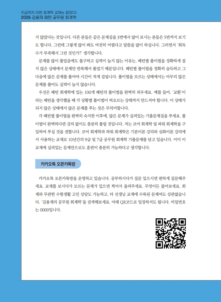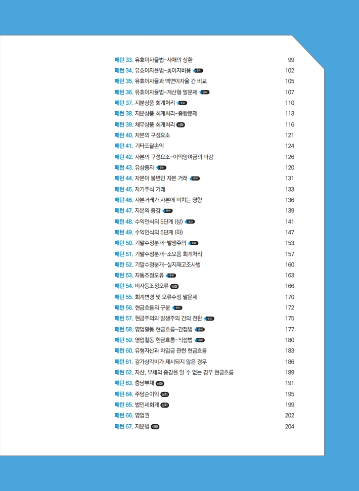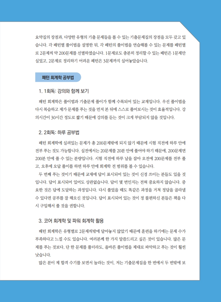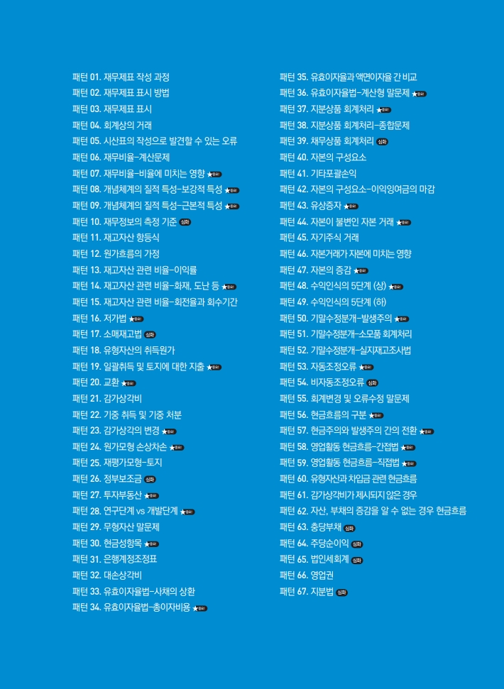패턴 회계학은 풀이법과 기출문제 풀이가 함께 수록되어 있는 교재입니다. 우선 풀이법을 다시 복습하고 제가 문제를 푸는 것을 먼저 본 뒤에 스스로 풀어보시는 것이 효율적입니다. 강 의시간이 30시간 정도로 짧기 때문에 강의를 듣는 것이 크게 부담되지 않을 것입니다.