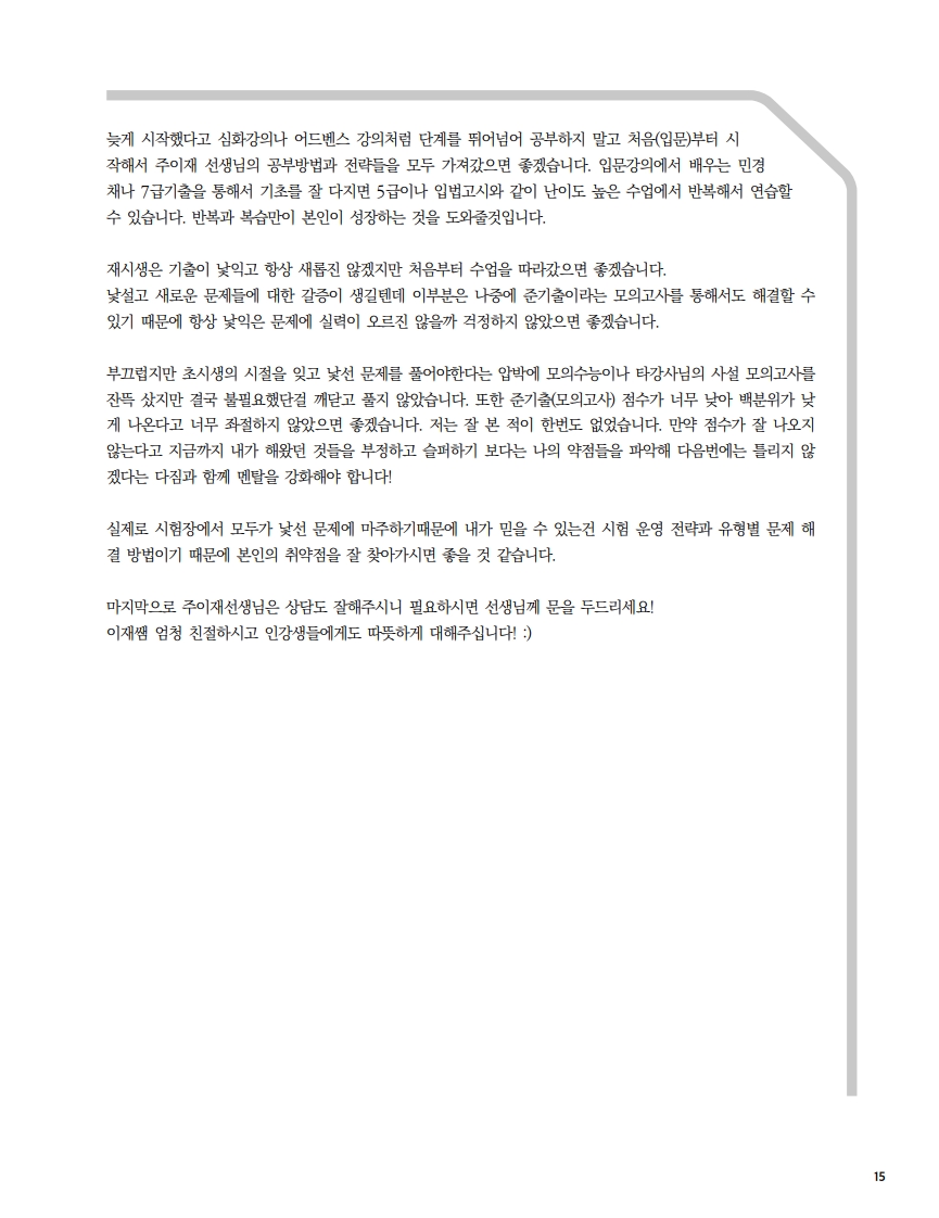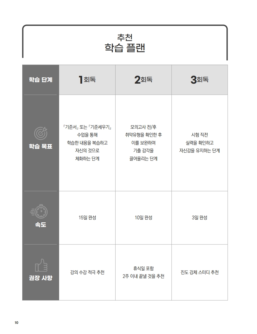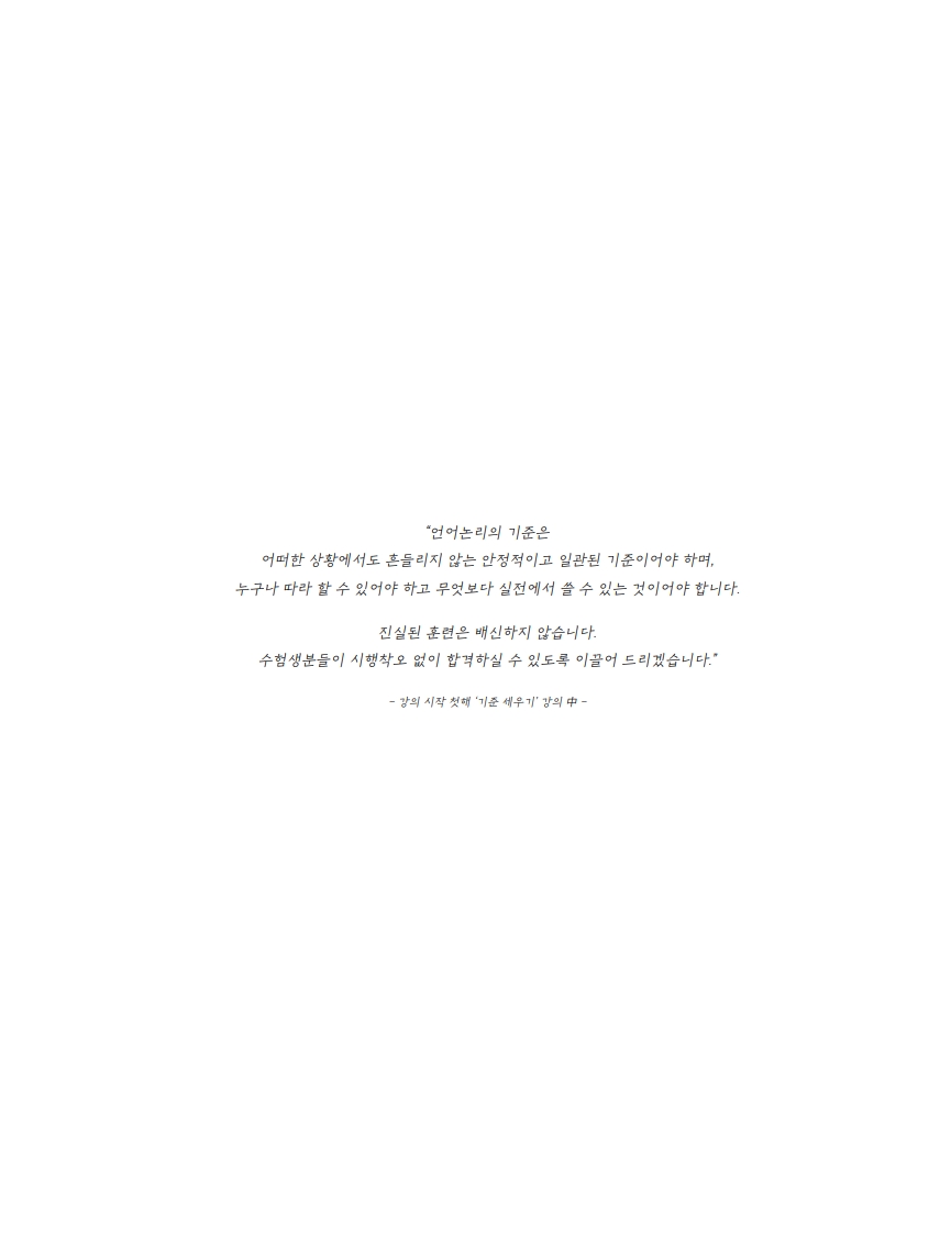 이 책은 ‘실전 매뉴얼’로서 독학이 가능하도록 내용과 구성면에서 최대한의 배려를 다 하였습니다. 독학하는 학생분들을 염두에 두고 작성했기에 이 책으로 독학을 해 나간다면 기준 없이 홀로 하는 막연한 기출 분석을 끝내고 흔들림 없이 앞으로 정진해 나가실 수 있으며, 이 책을 끝낸 이후에는 여러분의 실력은 틀림없이 비약적으로 성장해 있을 것입니다.