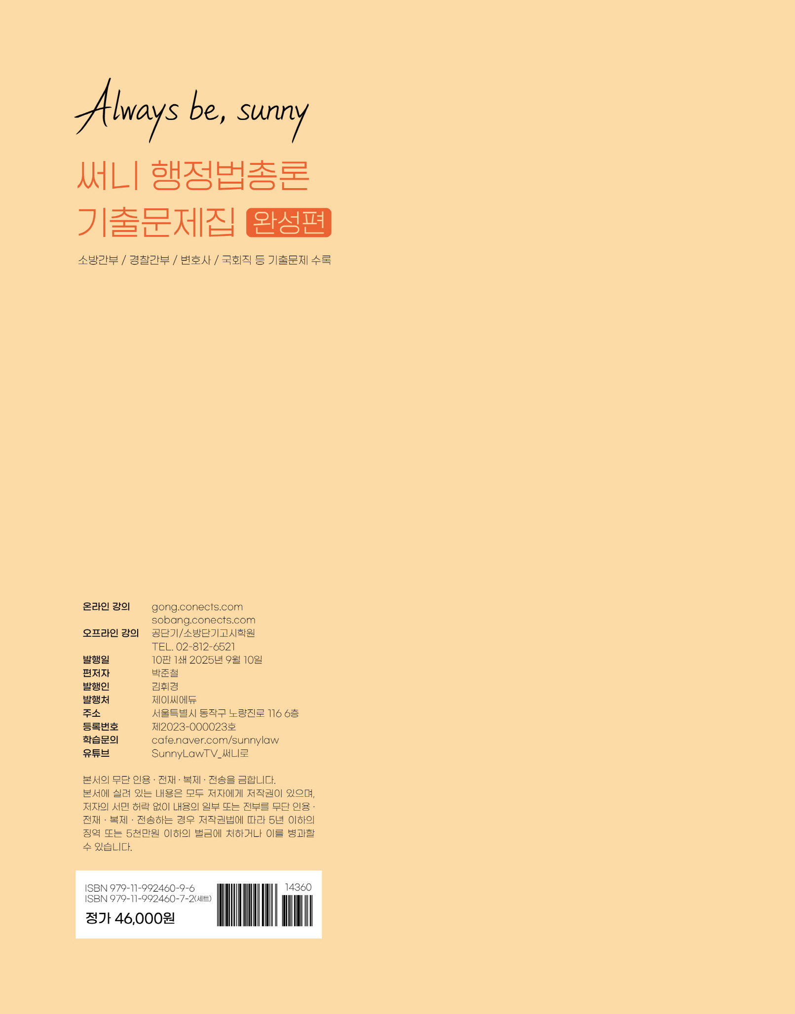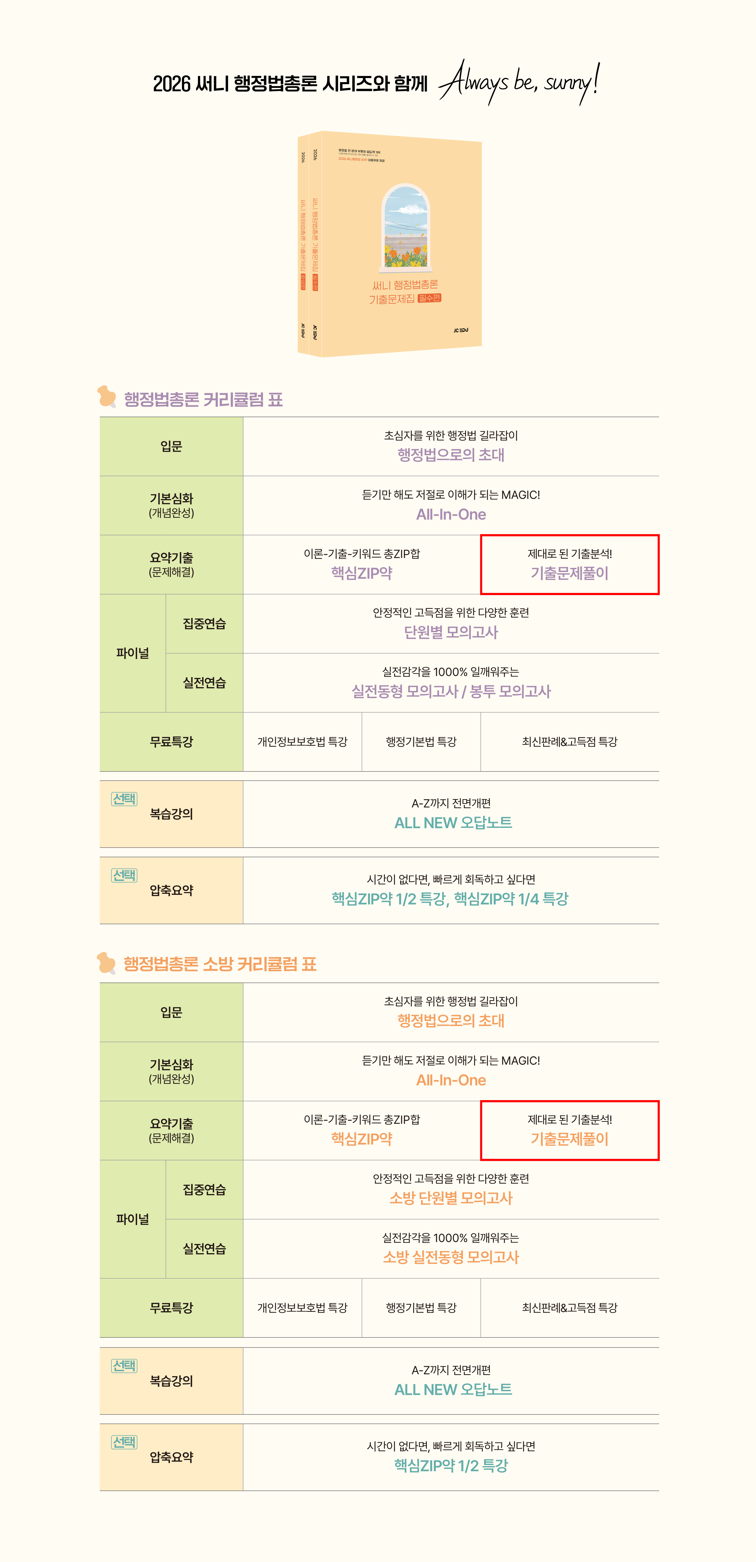 『2026 써니 행정법총론 기출문제집』의 가장 큰 변화는 기출문제의 분류입니다. [필수편]은 인사혁신처, 소방직 9급, 군무원 7·9급 기출문제들로 구성하고, [완성편]은 소방간부, 경찰간부, 변호사, 국회직 8·9급 등 기출문제들로 구성하여 수험 적합도를 높이는 데 힘썼습니다. 또한 [필수편]에는 ‘편’이 끝날 때마다 학습한 내용을 점검할 수 있도록 교재에 있는 빈출 지문으로 구성한 ‘마무리 하프 모의고사’를 새롭게 추가하였습니다. 이뿐만 아니라 행간을 넓히고 좀 더 선명한 서체를 사용함으로써 가독성을 올리기 위해 노력하였습니다. 이와 함께 2026년 국가직 9급 시험을 기준으로 한 직전 시행일 개정법령과 최신 판례뿐만 아니라 2024년 국가직 7급, 지방직·서울시 7급, 2025년 경찰간부, 소방간부, 변호사, 국가직 9급, 소방직 9급, 국회직 8급, 지방직·서울시 9급, 행정사, 군무원 7·9급 등의 최신 기출문제를 반영하였습니다.