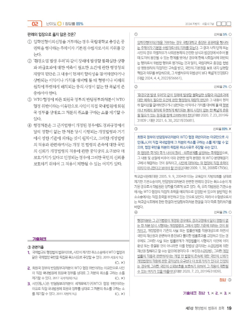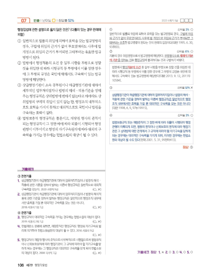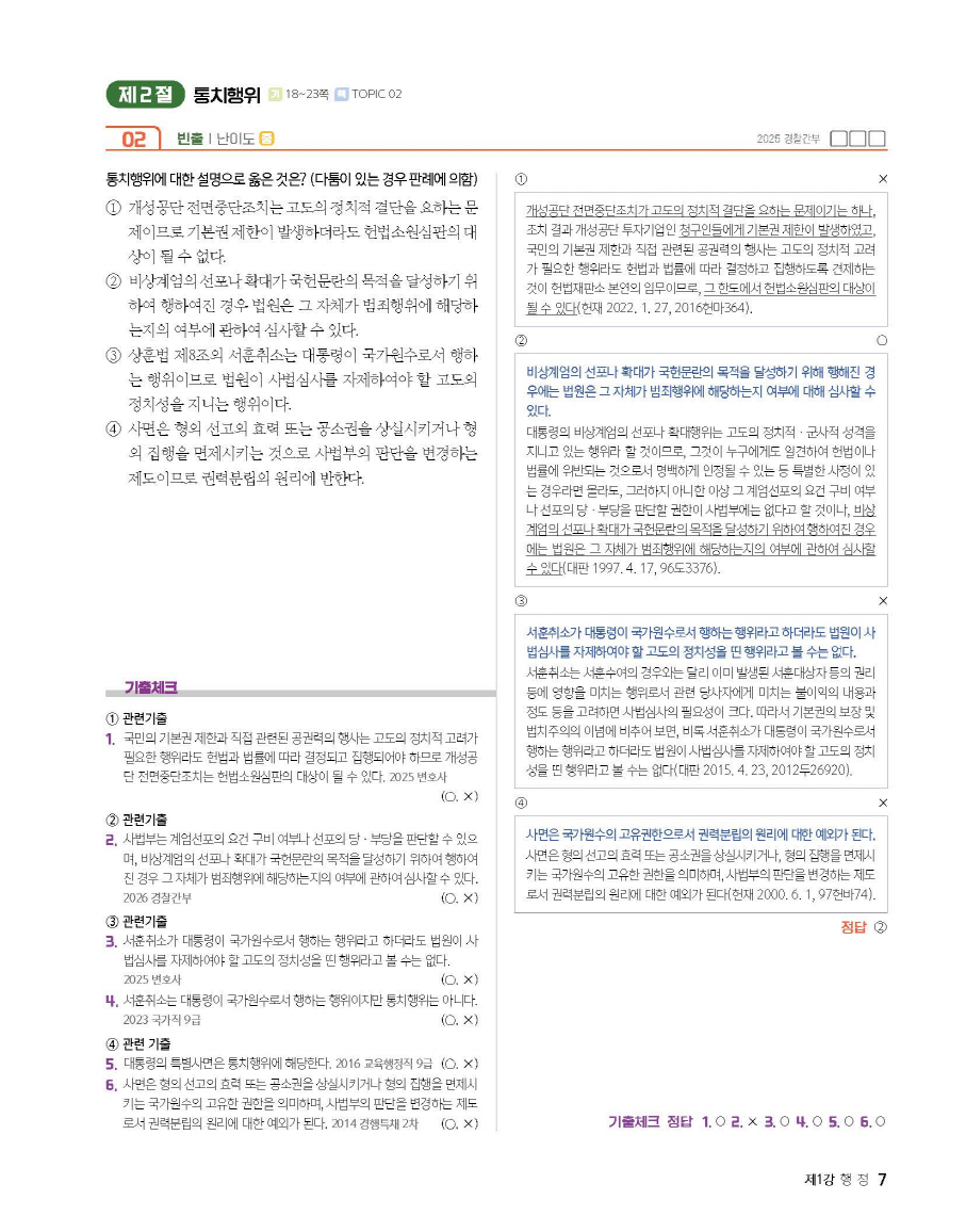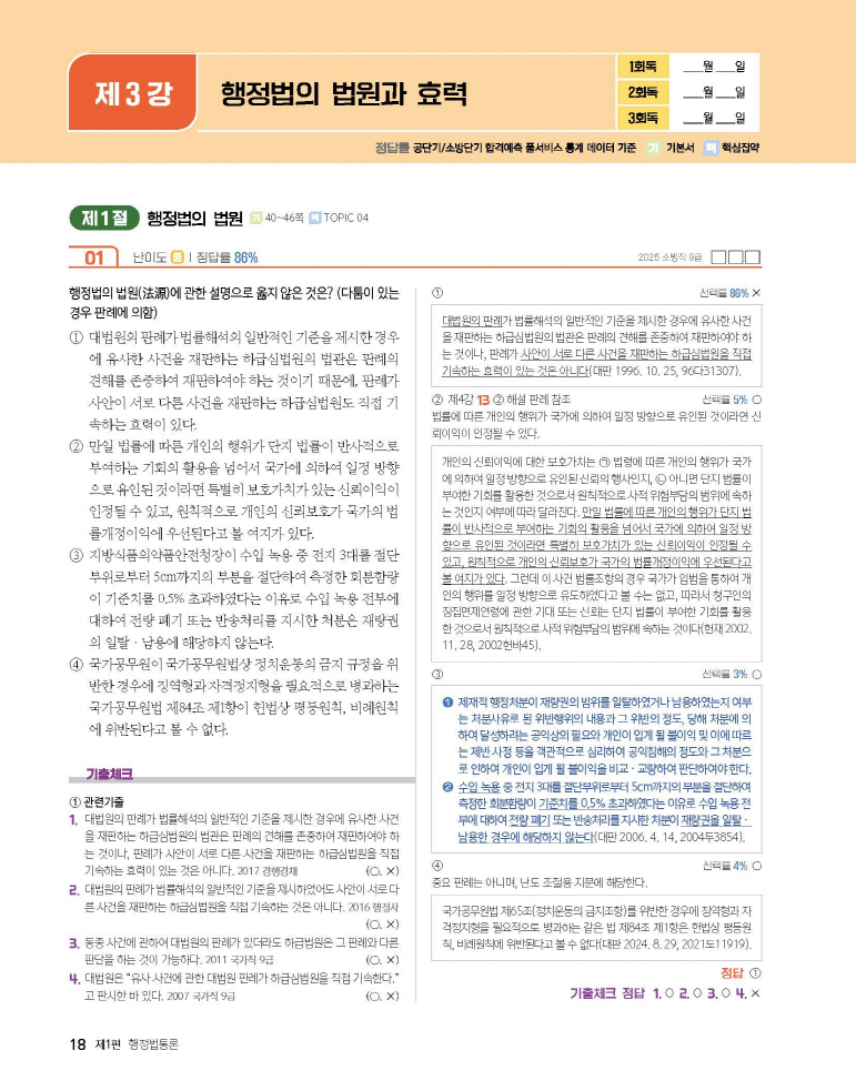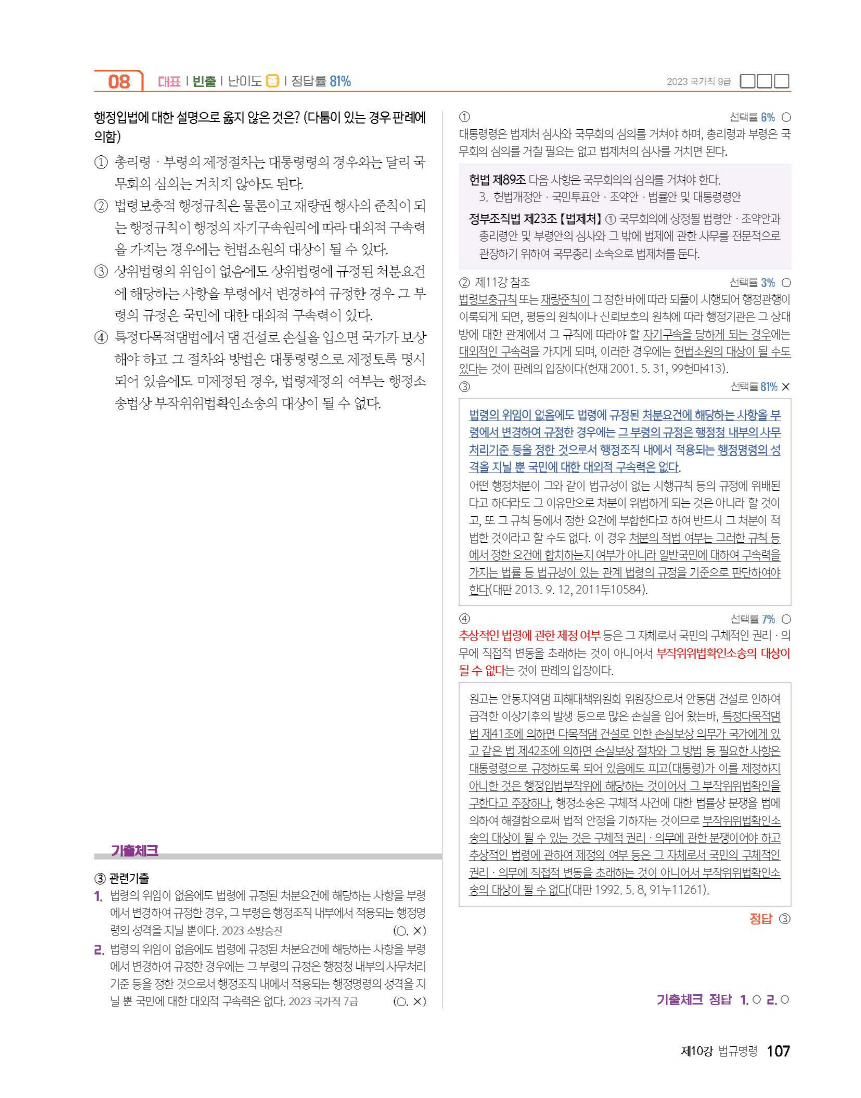 04 자주 출제되는 판례와 조문 위주로 집중 분석하여 이와 관련된 기출지문들을 OX문제로 풀어볼 수 있도록 ‘기출체크’를 기출문제 하단에 적절히 배치하였습니다. 이러한 관련기출 학습을 통해 하나의 판례나 조문이 실제 시험에서 어떤 식으로 다양하게 변형되는지를 파악함으로써 문제 적응력을 키울 수 있을 것입니다.