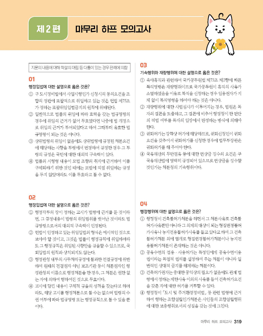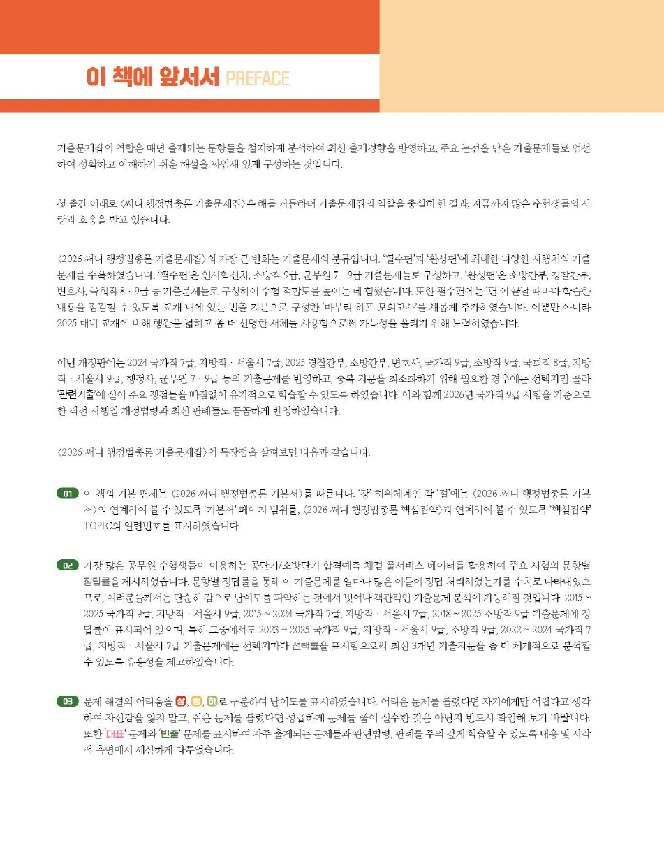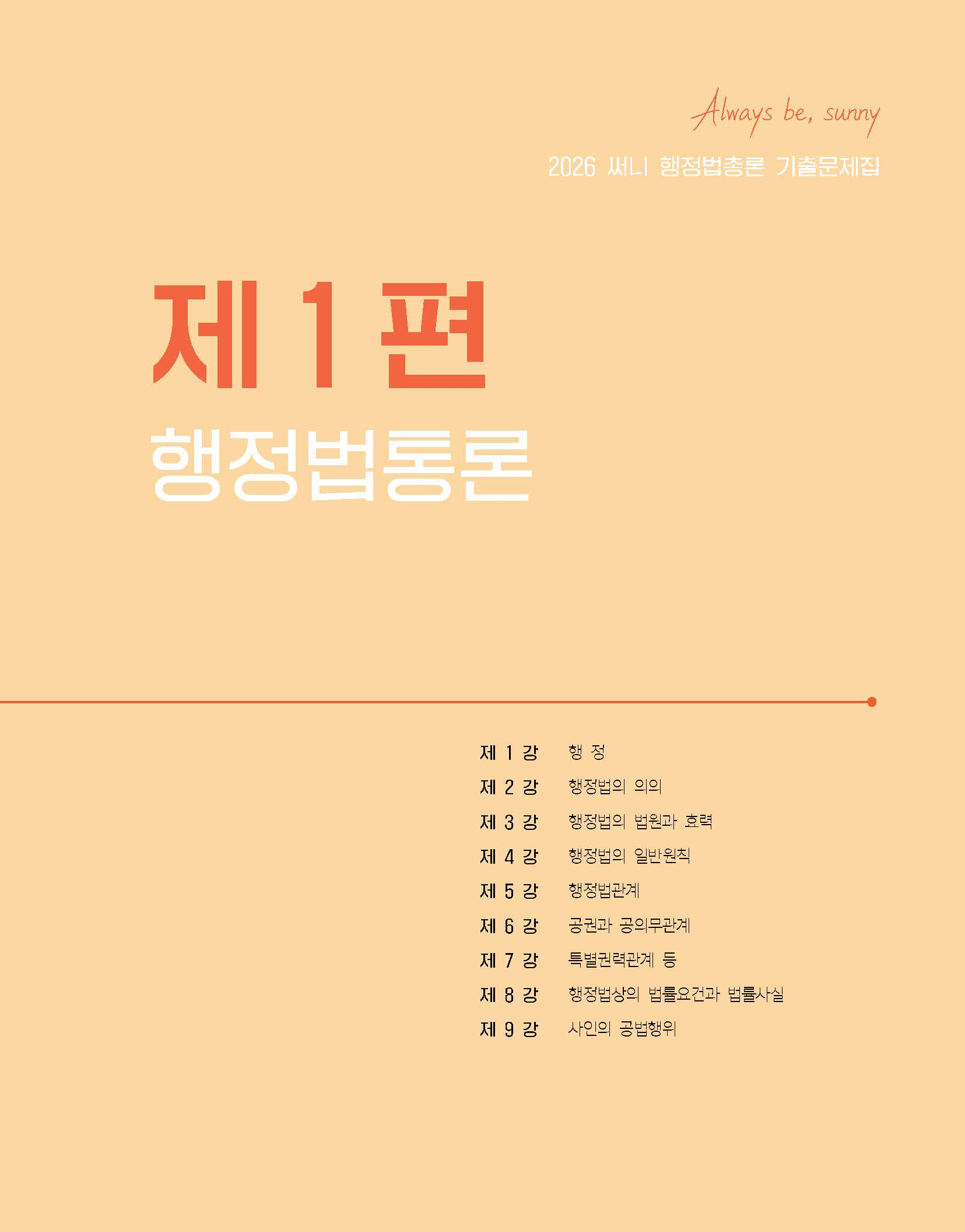 01 이 책의 기본 편제는 『2026 써니 행정법총론 기본서』를 따릅니다. ‘강’ 하위체계인 각 ‘절’에는 『2026 써니 행정법총론 기본서』와 연계하여 볼 수 있도록 ‘기본서’ 페이지 범위를, 『2026 써니 행정법총론 핵심집약』과 연계하여 볼 수 있도록 ‘핵심집약’ TOPIC 일련번호를 표시하였습니다.