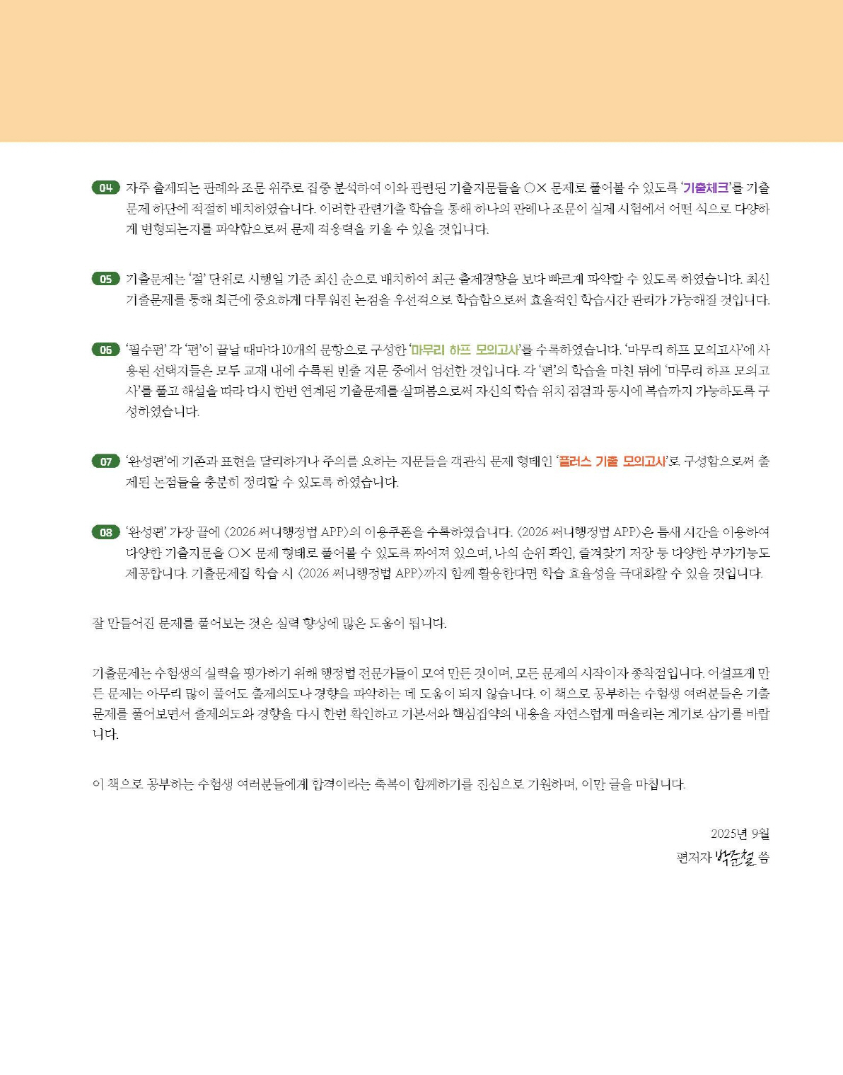 08 [완성편] 가장 끝에 <2026 써니행정법 APP>의 이용쿠폰을 수록하였습니다. <2026 써니행정법 APP은> 틈새 시간을 이용하여 다양한 기출지문을 OX문제 형태로 풀어볼 수 있도록 짜여져 있으며, 나의 순위 확인, 즐겨찾기 저장 등 다양한 부가기능도 제공합니다. 기출문제집 학습시 <2026 써니행정법 APP>까지 함께 활용한다면 학습 효율성을 극대화할 수 있을 것입니다.