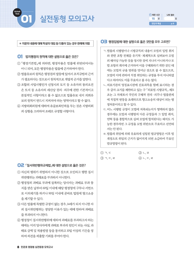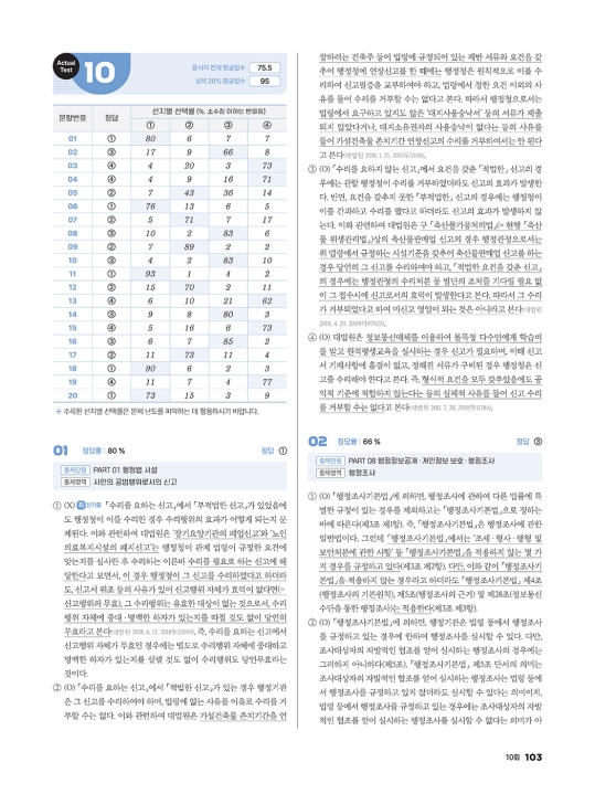 주요 출제 쟁점들을 촘촘히 선별한 후 실제 시험과 유사한 유형 및 난도의 문제로 제작하여 수록하였습니다. 실제 시험과 유사한 「최적」의 구성이므로 시간을 정해 풀어 간다면 풀이 감각을 충분히 배양할 수 있습니다.