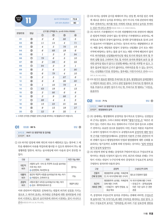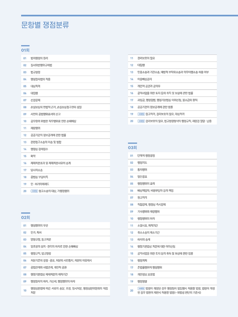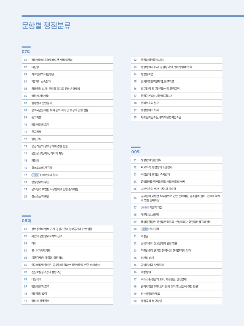 모든 문제의 쟁점을 분류한 표를 수록하여 문제별 쟁점 파악이 가능하고, 분류표를 활용해 취약한 쟁점의 문제들만 골라 보강 차원의 풀이를 하는 것도 가능합니다.