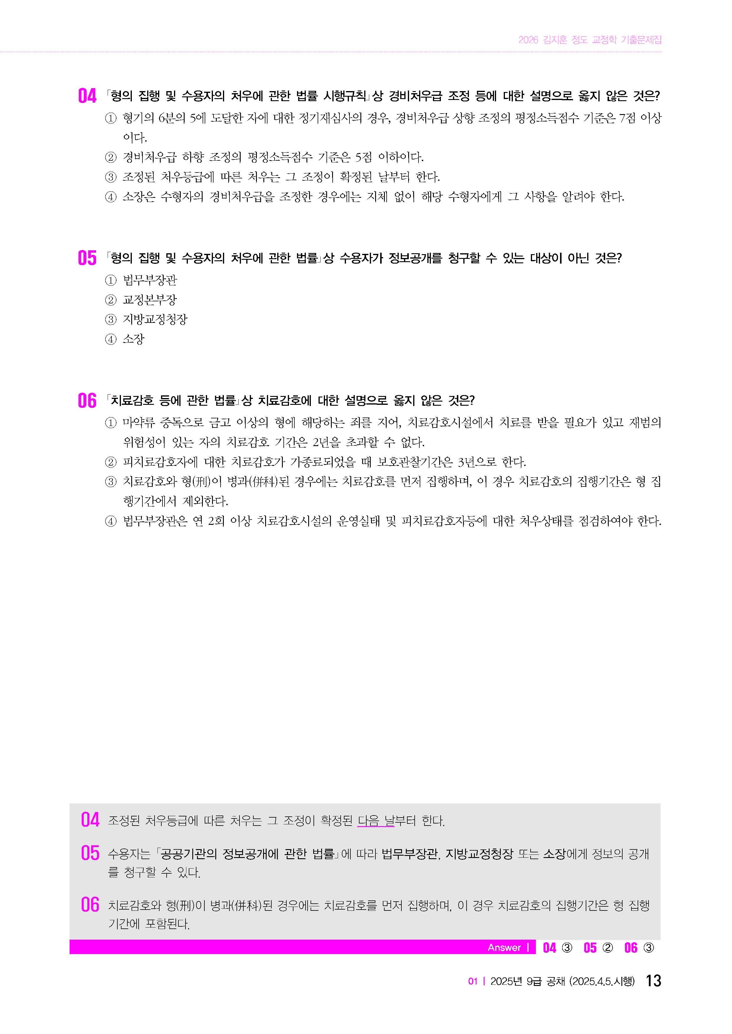 이 책은 9급 공채, 7급 공채, 9급 경력채용 문제를 연도별로 정리하였습니다. 문제집을 보기에 앞서 반드시 교정이론 및 법령에 대한 기본적인 이해와 암기가 있어야 합니다. 처음부터 이론적인 학습과 정리 없이 문제집을 보시는 것은 자칫 문제와 답을 외우는 식의 잘못된 학습이 될 수 있습니다. 최근의 문제는 단순암기식의 문제보다는 응용해야 하는 문제가 다수 출제되고 있습니다. 이러한 문제에 적응하기 위해서는 기본교재 또는 법령집에 대한 다독이 필수입니다.