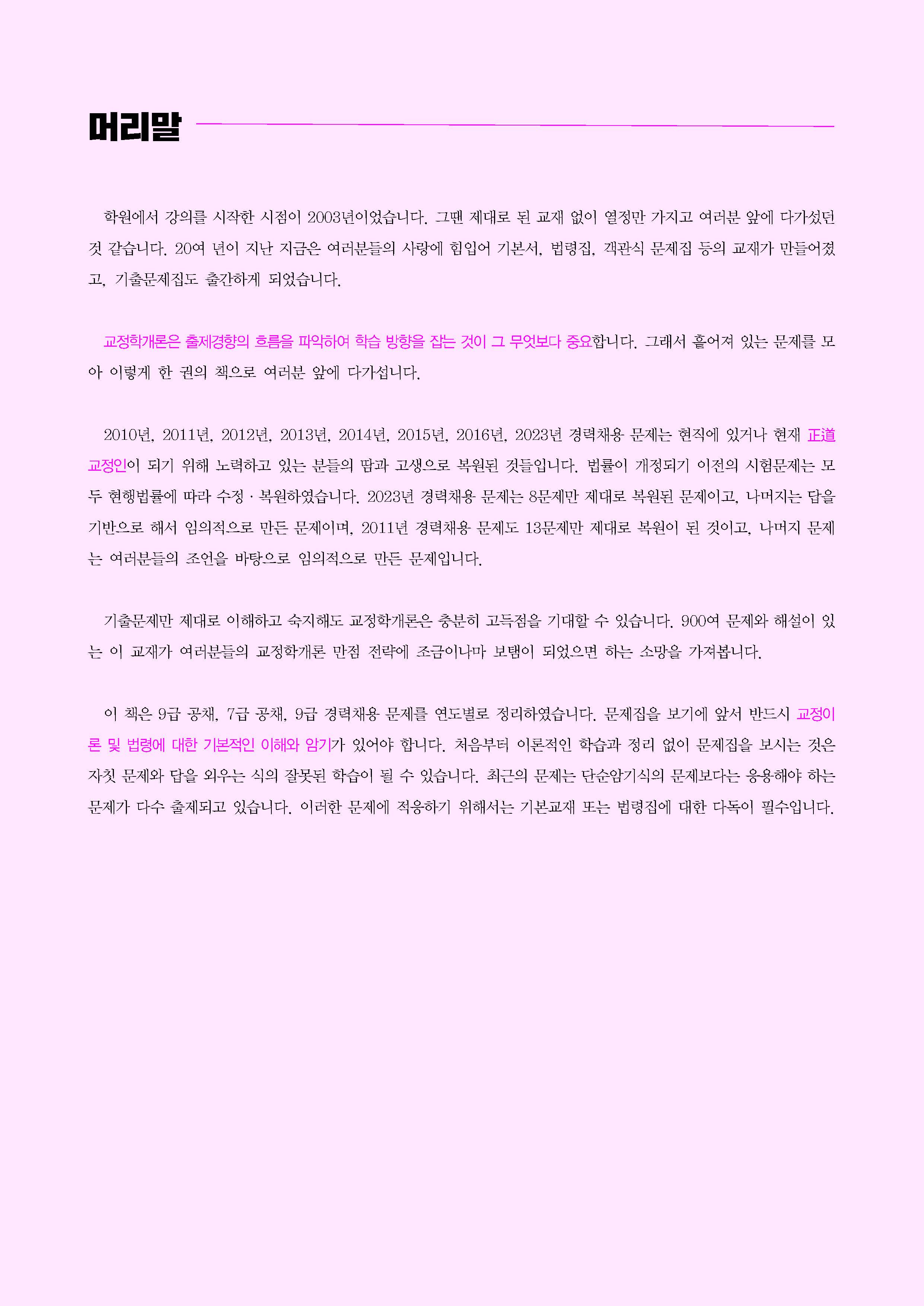 교정학개론은 출제경향의 흐름을 파악하여 학습 방향을 잡는 것이 그 무엇보다 중요합니다. 그래서 흩어져 있는 문제를 모아 이렇게 한 권의 책으로 여러분 앞에 다가섭니다.