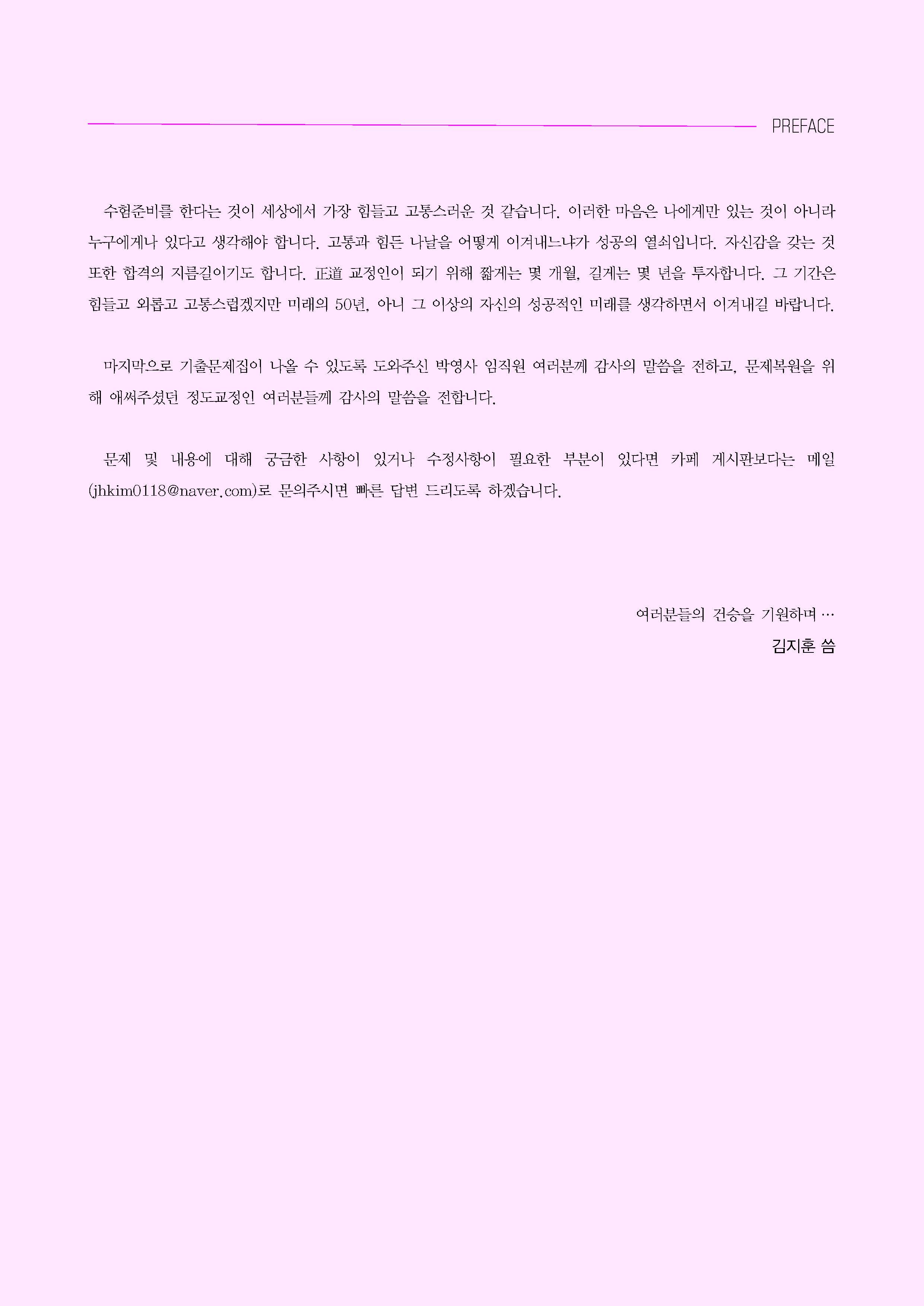 학원에서 강의를 시작한 시점이 2003년이었습니다. 그땐 제대로 된 교재 없이 열정만 가지고 여러분 앞에 다가섰던 것 같습니다. 20여 년이 지난 지금은 여러분들의 사랑에 힘입어 기본서, 법령집, 객관식 문제집 등의 교재가 만들어졌고, 기출문제집도 출간하게 되었습니다.