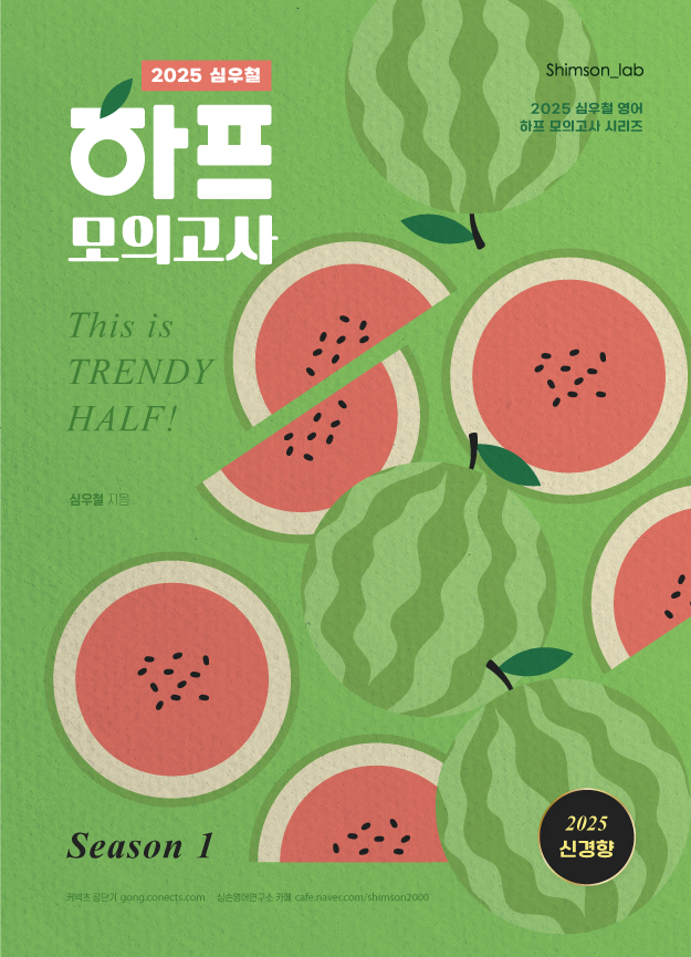 『2025 심우철 하프 모의고사』 시리즈는 올해 총 다섯 시즌으로 구성되어 시기별 수험생의 학습 단계에 맞춰 설계되었습니다. 모든 시즌은 최근 3개년 공무원 영어 시험을 참고하여 난이도를 조절하였으며, 이 중 『2025 심우철 하프 모의고사 Season 1』은 특히 수험생의 기본을 점검하며 본격적으로 실전에 대비하기 위한 단계로, 평이한 난이도로 출제하였습니다.