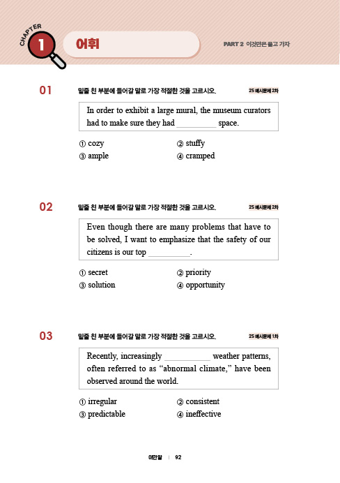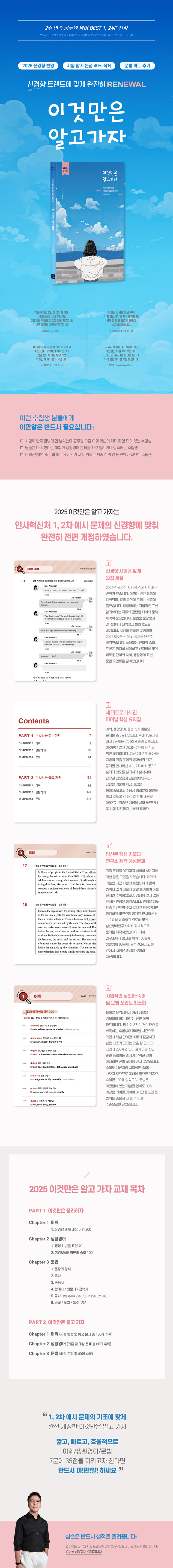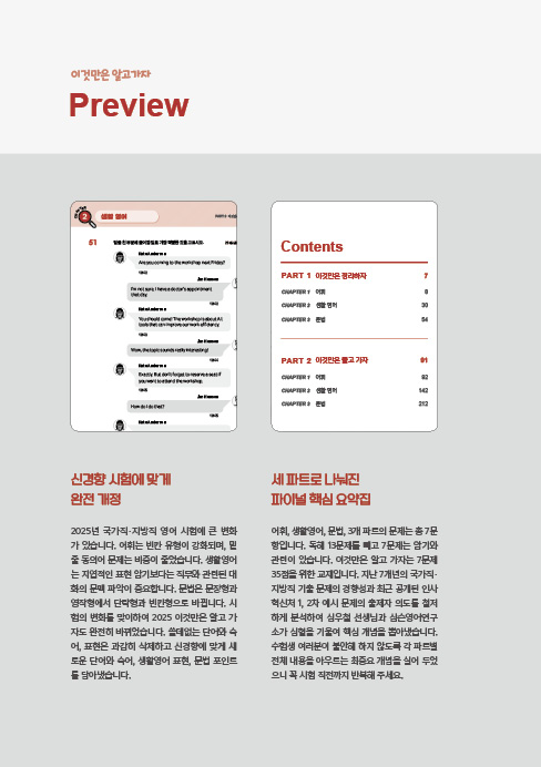 2025년 국가직?지방직 영어 시험에 큰 변화가 있습니다. 어휘는 빈칸 유형이 강화되며, 밑줄 동의어 문제는 비중이 줄었습니다. 생활영어는 지엽적인 표현 암기보다는 직무와 관련된 대화의 문맥 파악이 중요합니다. 문법은 문장형과 영작형에서 단락형과 빈칸형으로 바뀝니다. 시험의 변화를 맞이하여 2025 이것만은 알고 가자도 완전히 바뀌었습니다. 불필요한 단어와 숙어, 표현은 과감히 삭제하고 신경향에 맞게 새로운 단어와 숙어, 생활영어 표현, 문법 포인트를 담아냈습니다.