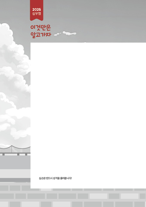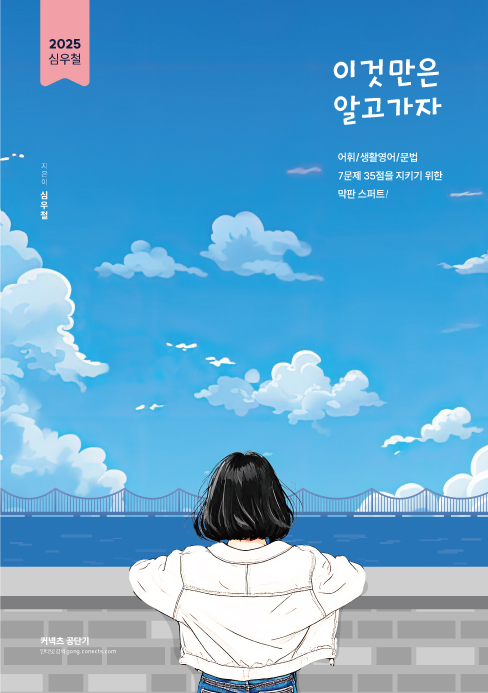어휘, 생활영어, 문법, 3개 파트의 문제는 총 7문항입니다. 독해 13문제를 빼고 7문제는 주로 암기와 관련된 문제들입니다. 이것만은 알고 가자는 7문제 35점을 위한 교재입니다. 지난 7개년의 국가직· 지방직 기출 문제의 경향성과 최근 공개된 인사혁신처 1, 2차 예시 문제의 출제자 의도를 철저하게 분석하여 심우철 선생님과 심슨영어연구소가 심혈을 기울여 핵심 개념을 뽑아냈습니다. 수험생 여러분이 불안해하지 않도록 각 파트별 전체 내용을 아우르는 최중요 개념을 실어 두었으니 꼭 시험 직전까지 반복해 주세요.