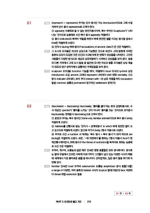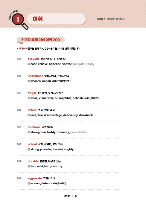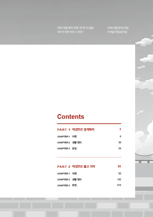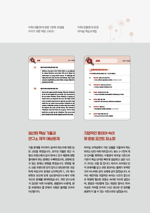 파이널 요약집에서 가장 심혈을 기울여야 하는 파트는 단연 어휘 파트입니다. 평소 2~3천여 개의 단어를 회독하는 수험생이 파이널 시즌으로 가면서 핵심 단어만 빠르게 점검하고 싶은 니즈가 크다는 것을 잘 압니다. 따라서 200개의 단어 표제어를 잡고 관련 동의어는 출제가 유력한 것이 아니라면 굳이 교재에 싣지 않았습니다. 숙어도 예전처럼 지엽적인 숙어는 나오지 않으므로 독해에 필요한 최중요 숙어만 100개 실었고, 문법은 이것만은 알고가자에 있는 개념만 알아도 80% 이상은 커버될 것이며 3시간 정도면 전 범위를 충분히 다 볼 수 있는 수준으로만 실었습니다.