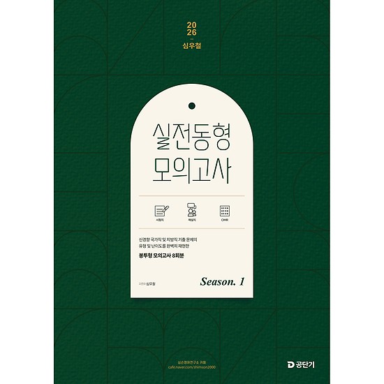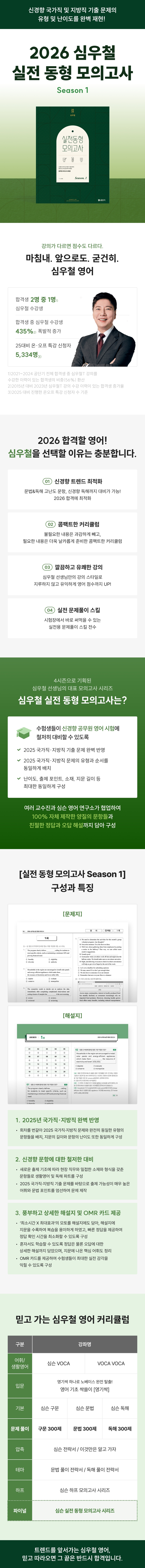 신경향 문항에 대한 수험생들의 부담을 덜어 주기 위해, 새로운 출제 기조에 따라 현장 직무와 밀접한 소재와 형식을 갖춘 문항들로 생활영어 및 독해 파트를 구성하였습니다. 또한 2025 국가직·지방직 기출 문제를 바탕으로, 출제 가능성이 매우 높은 어휘와 문법 포인트를 엄선하여 문제를 제작하였습니다. 이제 수험생들은 『2026 심우철 실전 동형 모의고사』를 통해 신경향 문항들에 철저히 대비할 수 있을 것입니다.