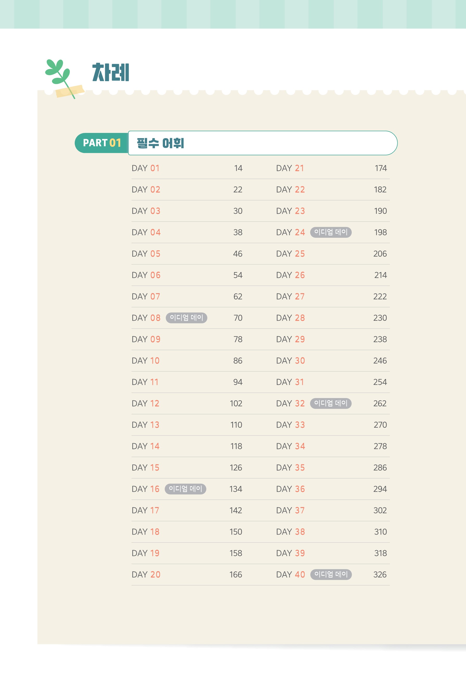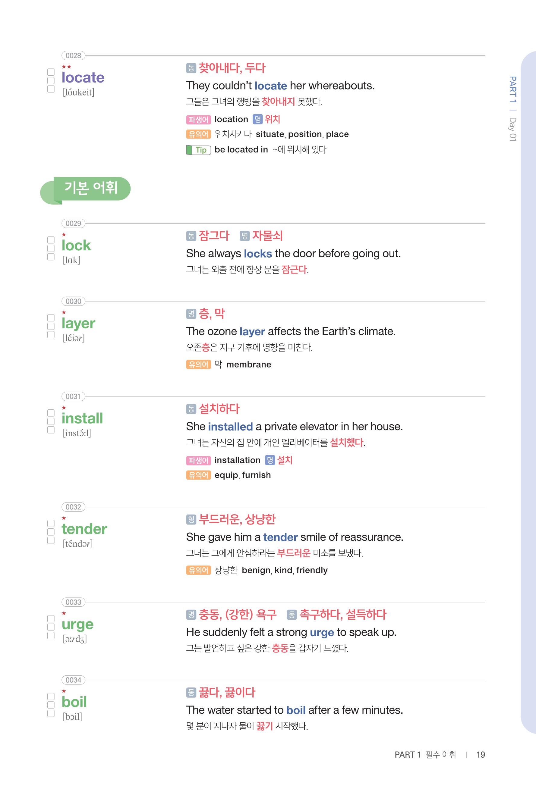 이 책에 수록된 ‘학습 스케줄 추천’을 자세히 읽고 그대로 진행할 것을 권합니다. 초반 학습에서는 원하는 만큼 단어를 암기하지 않았더라도 뒤도 돌아보지 말고 빠르게 진행하시기 바랍니다. 어느 정도 반복 회독이 되면 조금씩 암기가 되고 있다는 희망의 씨앗이 보일 것이며 이는 이후 학습에 대한 충분한 동기부여가 될 것입니다. 이제 이러한 동기부여를 통해 목표하는 시험까지 반복 암기를 지속한다면 여러분은 원하는 결과를 꼭 얻을 수 있을 것입니다.
