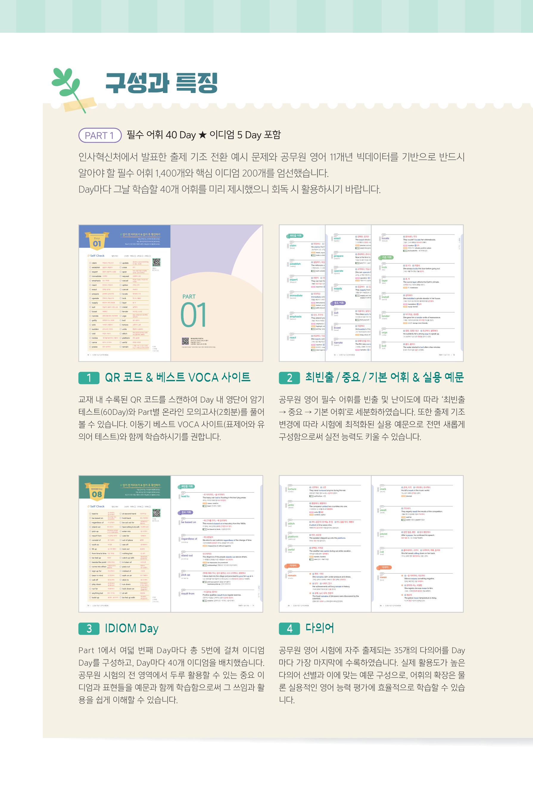 영어 시험을 대비함에 있어 가장 기본이 되는 어휘인 교육부 선정 초등학생이 꼭 알아야 할 영단어, 그리고 중고등 영어과 교육과정 및 수능 시험 대비용 어휘라는 기본 어휘를 한 축으로 그동안 공무원 영어 시험에서 출제되었던 기출 문제를 모두 분석하여 시험에 가장 반복되어 사용된 어휘만을 선별하여 수록했습니다. 또한 실제 공무원 업무 수행에 필요한 실무 중심의 실용 어휘를 새롭게 선별하여 업무 분야별로 분류하여 수록했습니다.