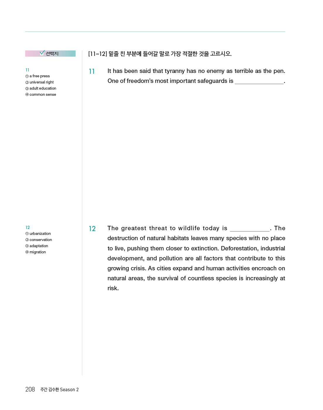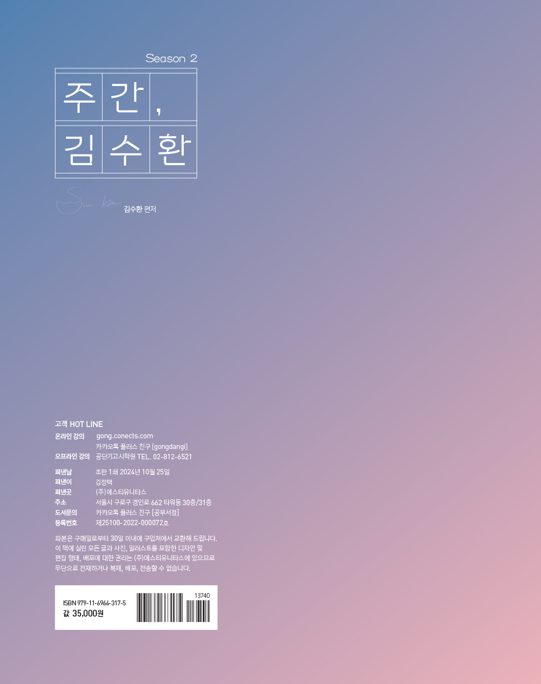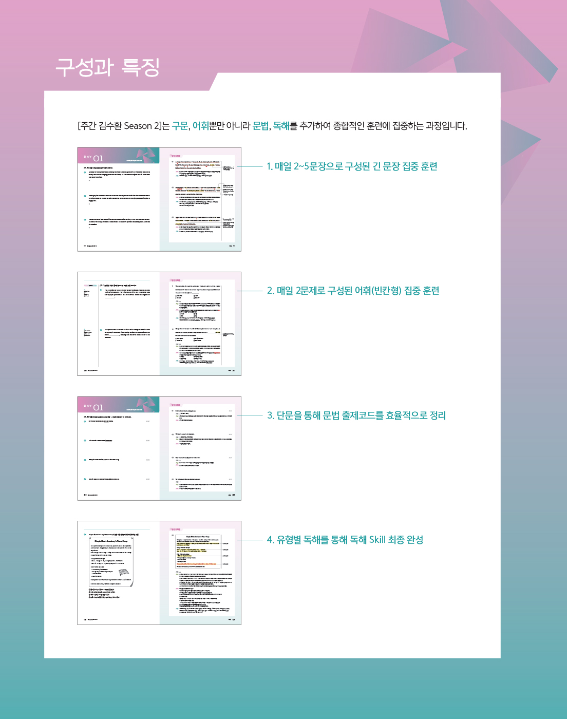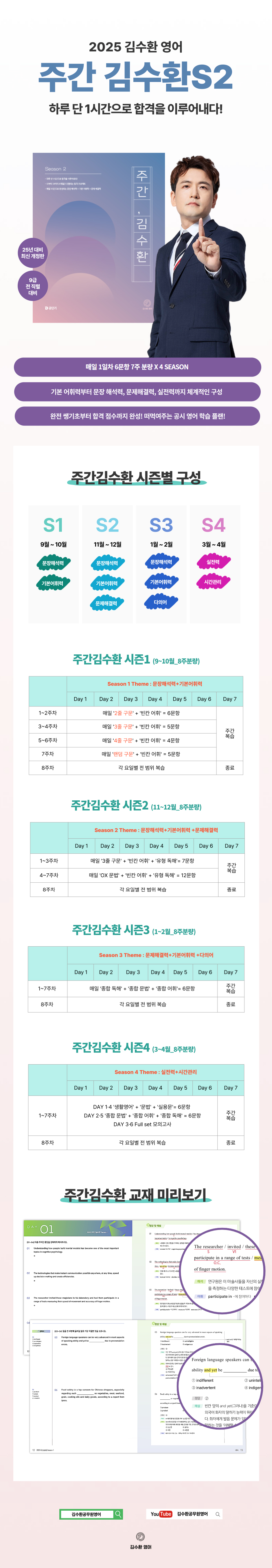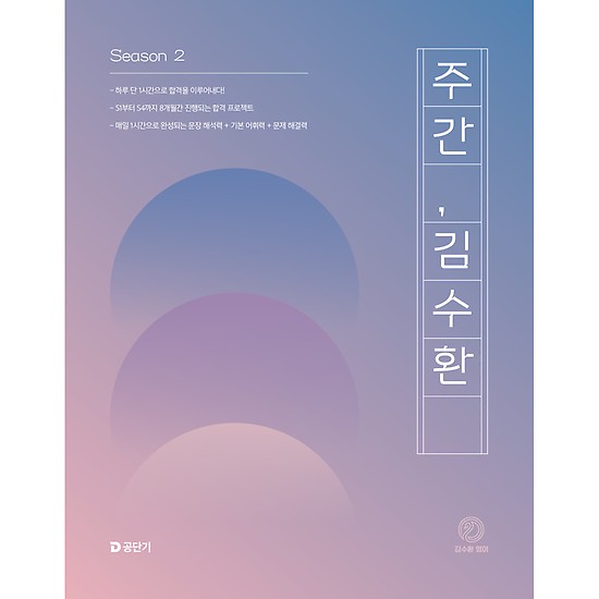 [2025 주간 김수환 Season 2]는 2025년 공무원 영어 시험에 전략적으로 대비할 수 있게 해주는 [주간 김수환] 시리즈 중 두 번째 교재입니다. 이번 Season 2 교재의 주안점은 구문, 어휘, 문법, 독해 문제를 통해 종합적으로 훈련함으로써, 문장 해석력과 기본 어휘력은 물론, 문제 해결력까지 기르는 것입니다.