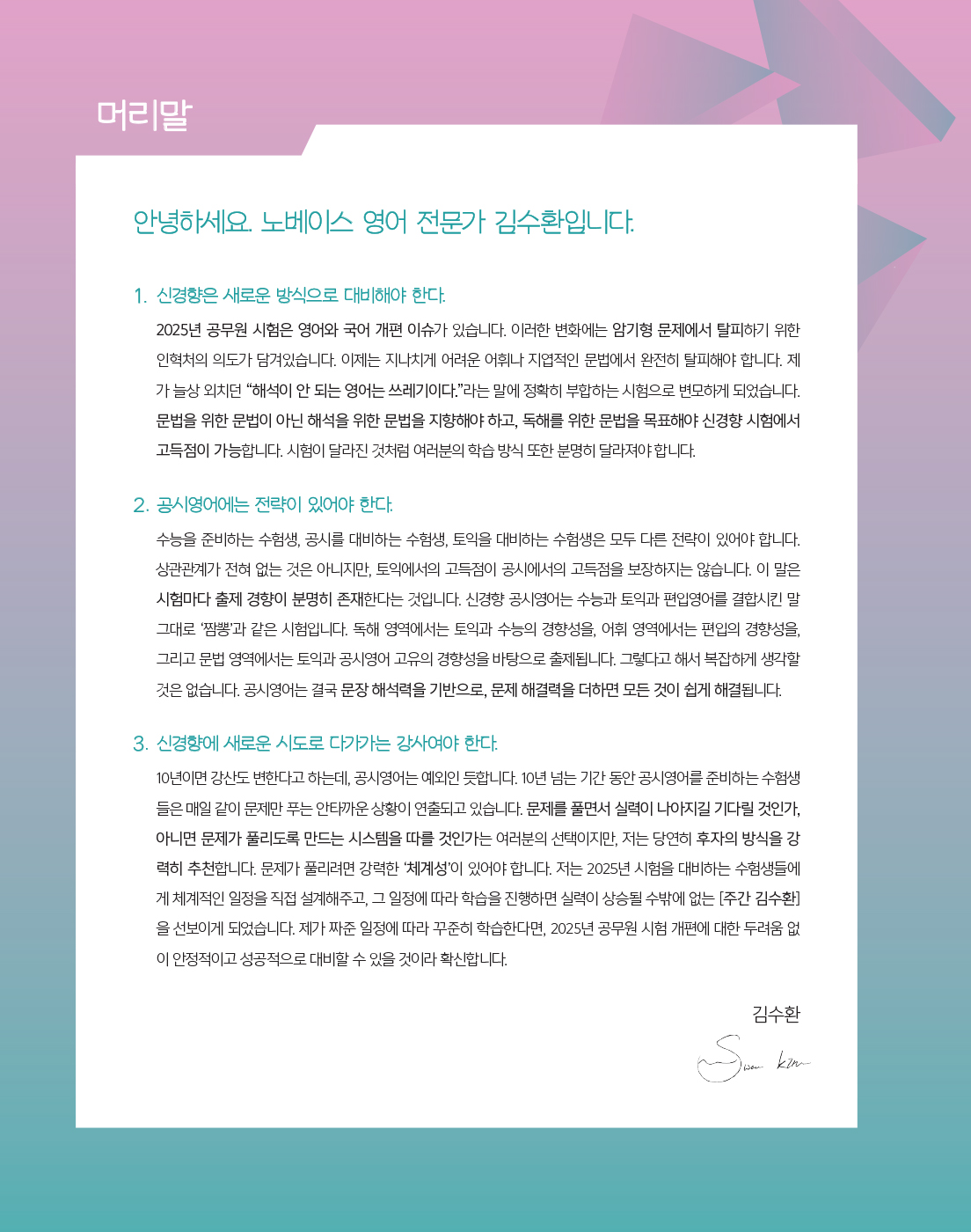 이처럼 [2025 주간 김수환 Season 2]는 2025년 시험을 대비하는 수험생들에게 체계적인 일정을 직접 설계해주고, 그 일정에 따라 학습을 진행하게 합니다. 이를 따라 꾸준히 공부한다면, 수험생들은 신경향 문제에 대한 두려움 없이 안정적으로 대비하여 합격에 이를 수 있을 것이라 확신합니다.