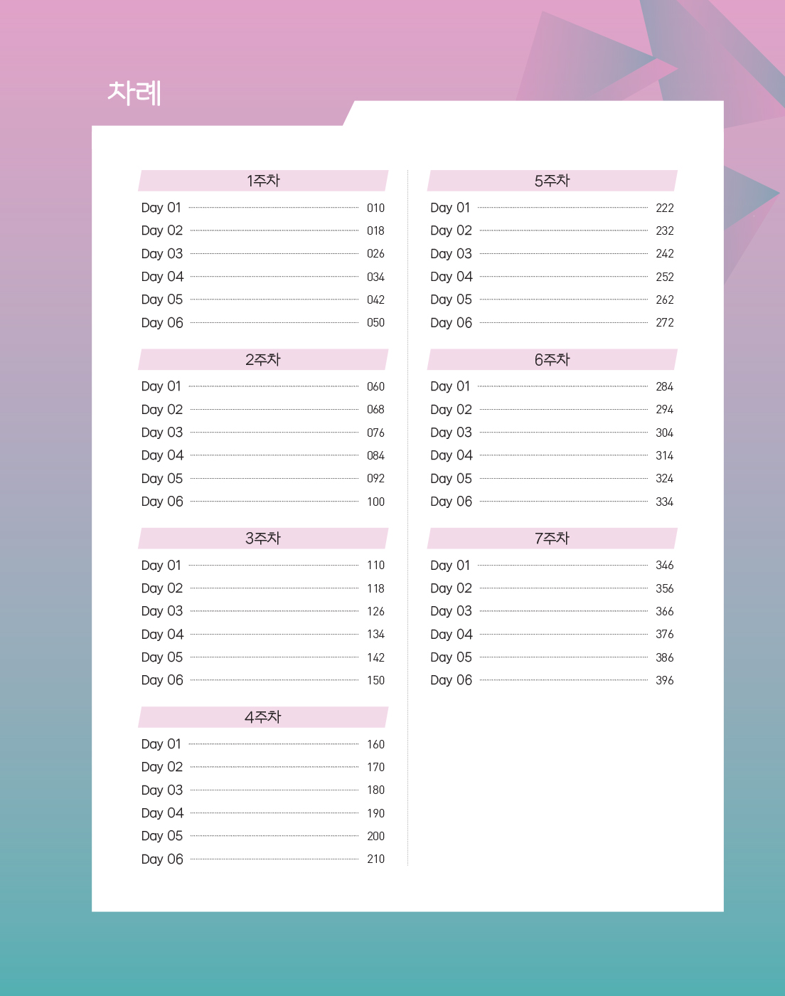 본 교재는 총 7주 분량으로 구성되었으며, 각 주마다 Day 1~Day 6으로 총 6일치 학습량을 제공합니다. 이 중 1주차~3주차는 하루에 구문 3문제, 독해 2문제, 어휘 2문제를, 4주차~7주차는 하루에 문법 8문제, 독해 2문제, 어휘 2문제를 학습하게 됩니다. 그러고 나서 8주차에는 Day별 전범위 복습을 진행하도록 권하는데, 이를 통해 7주 동안 배운 내용들을 완전히 내 것으로 만들 수 있게 될 것입니다.