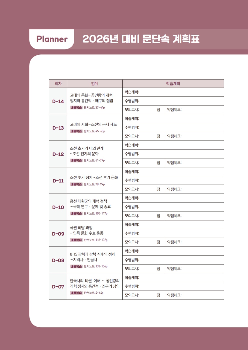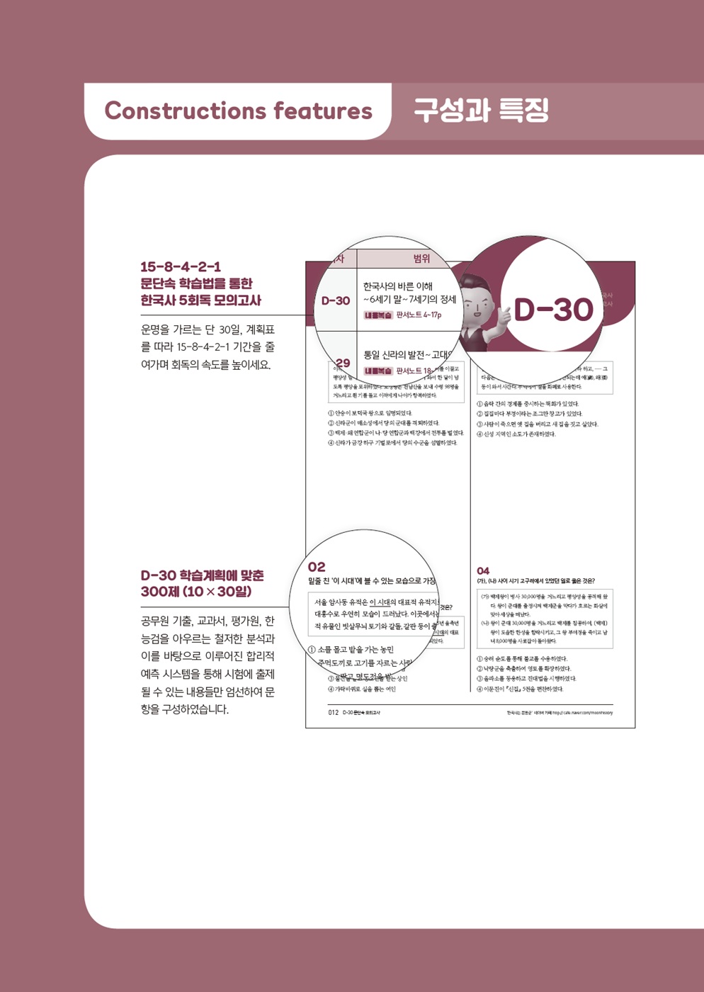 시험 당일 한국사를 가장 빠르고 정확하게 풀어낼 수 있는 사람은 공부 기간이 오래된 사람도 아니고 많은 책을 학습한 사람도 아닙니다. 바로 방금 전에 본 사람이 가장 빠르고 정확하게 문제를 풀어낼 수 있습니다. 그만큼 한국사는 암기해야 할 사항이 많아 휘발성이 강한 과목이기 때문입니다. 여기서 방금 본 사람이란 벼락치기를 한 사람을 말하는 것이 아니라 최종 마무리를 체계적으로 한 사람을 말합니다. 따라서 마무리 학습법은 방금 본 느낌으로 시험장에 들어갈 수 있도록 체계적으로 준비해야 하고 그것이 바로 D-30 문단속 학습법입니다.