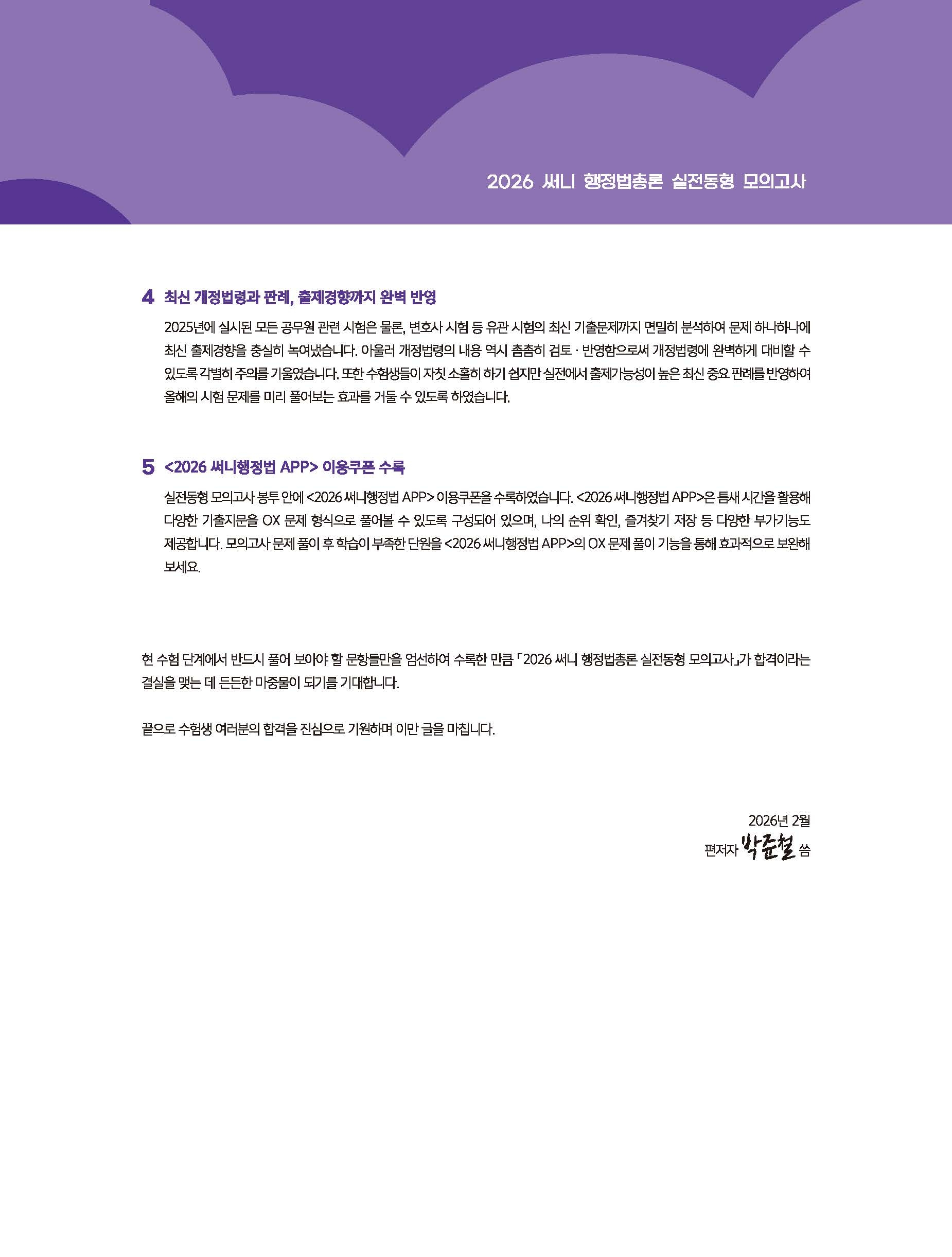 현 수험 단계에서 반드시 풀어 보아야 할 문항들만을 엄선하여 수록한 만큼 「2026 써니 행정법총론 실전동형 모의고사」가 합격이라는 결실을 맺는 데 든든한 마중물이 되기를 기대합니다.