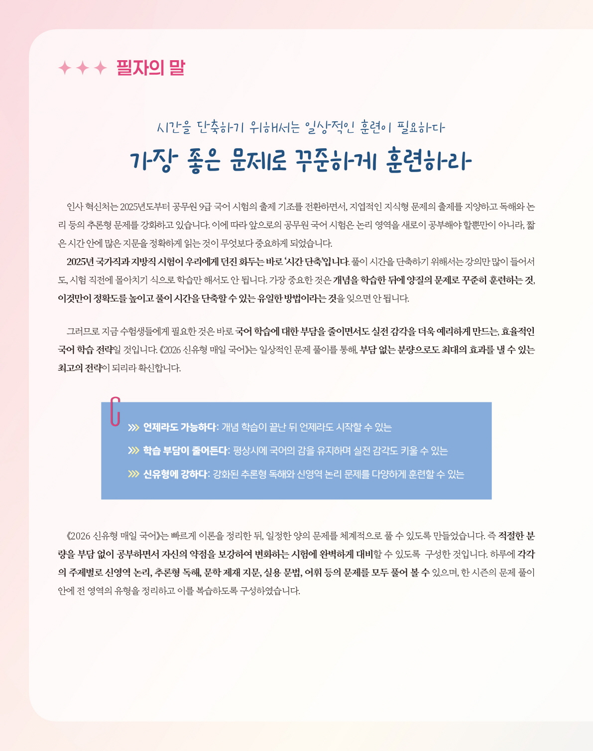 - 학습 부담이 줄어든다: 평상시에 국어의 감을 유지하며 실전 감각도 키울 수 있는