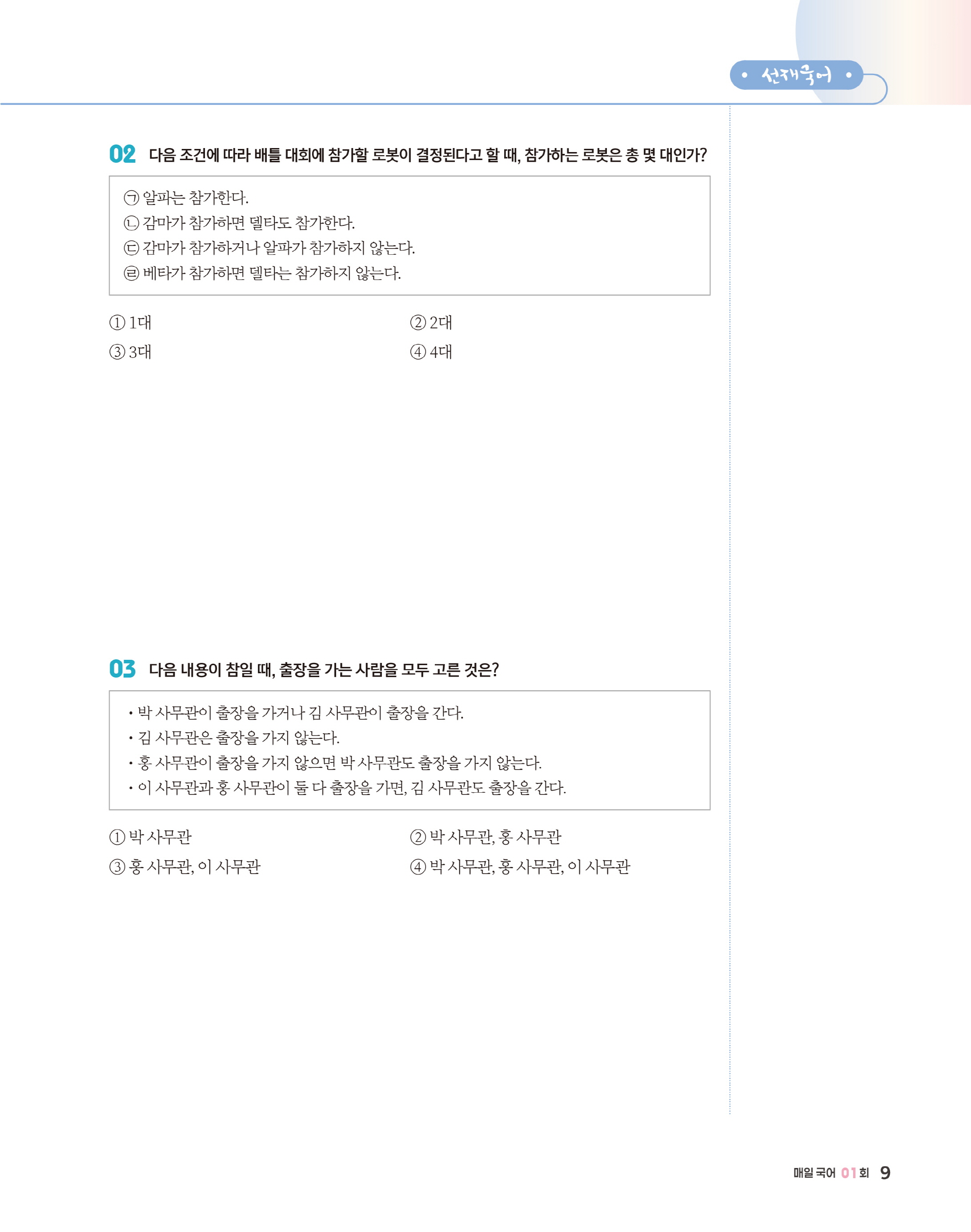 하루에 각각의 주제별로 신영역 논리, 추론형 독해, 문학 제재 지문, 실용 문법, 어휘 등의 문제를 모두 풀어 볼 수 있도록 구성했습니다.